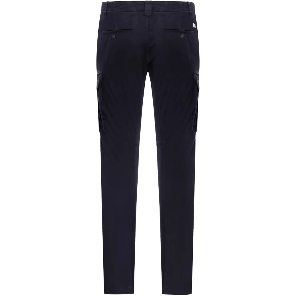 синие хлопковые брюки с накладными карманами, застежкой на пуговицы, шлевками для ремня и прямыми штанинами