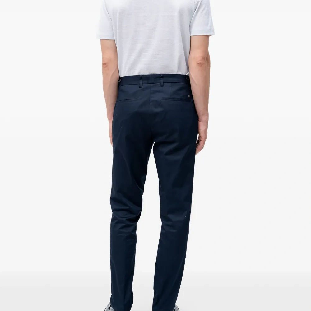 тёмно-синие шлевки на поясе, боковые карманы с разрезами, задние прорезные карманы, скрытая застёжка
