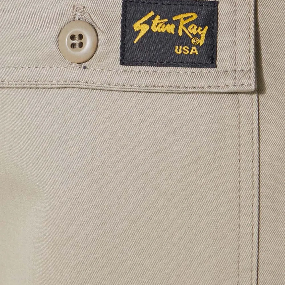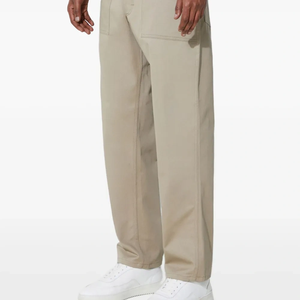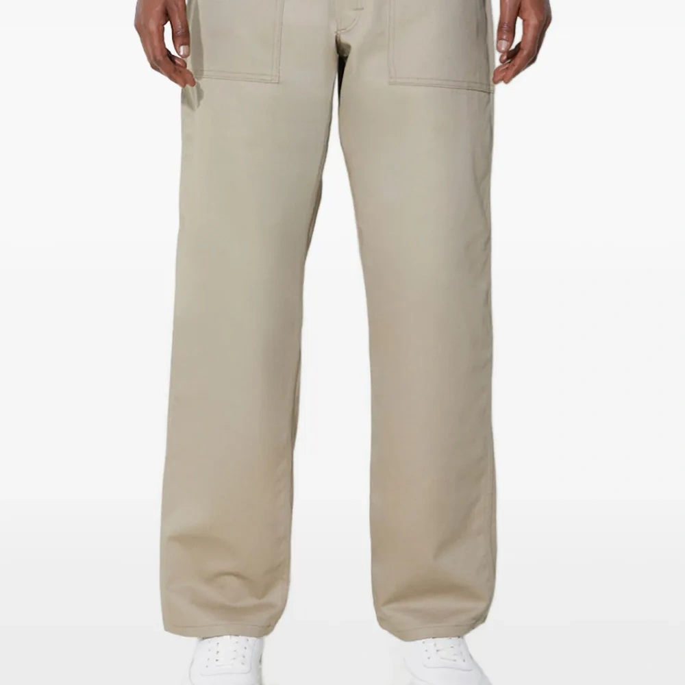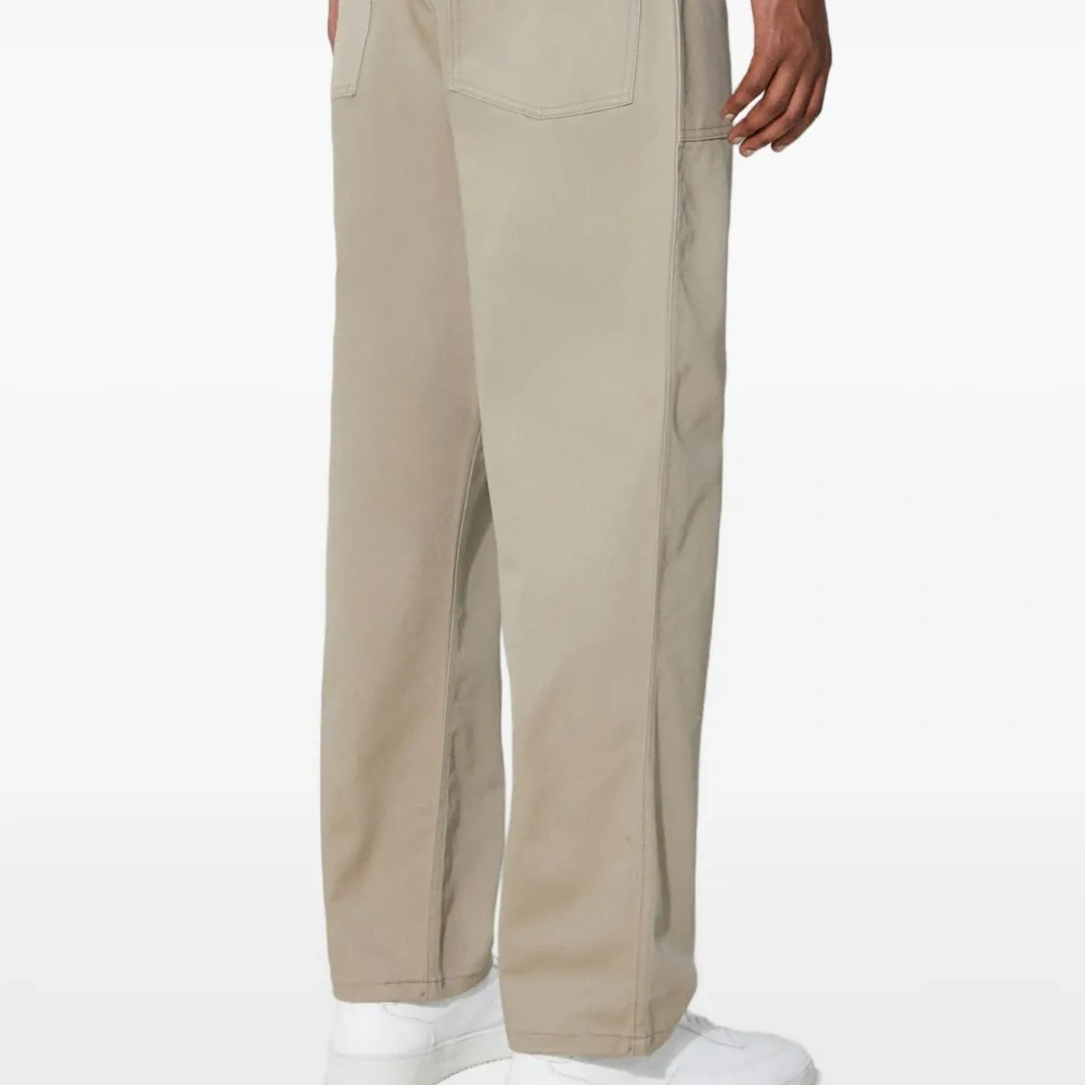 светло-бежевый, задний клапан-карман, застегивается на пуговицы, однотонная строчка, нашивка с логотипом