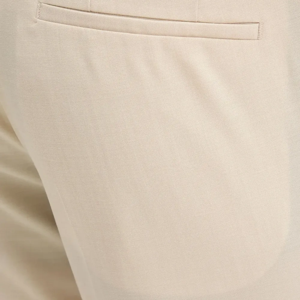 бежевые без складок спереди прямые брючины задние прорезные карманы застежка на пуговицу и молнию