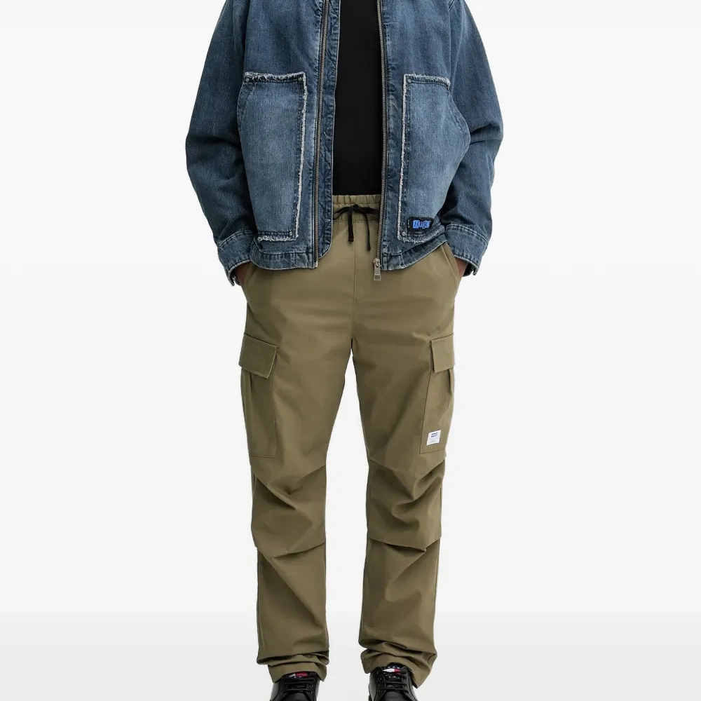 хаки зелёный, накладные карманы, застёжка на шнурке, нашивка с логотипом, задние карманы