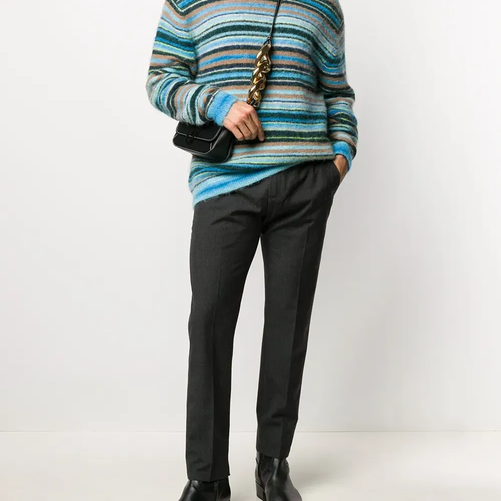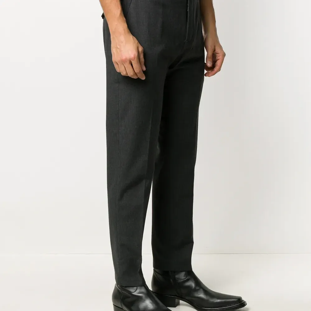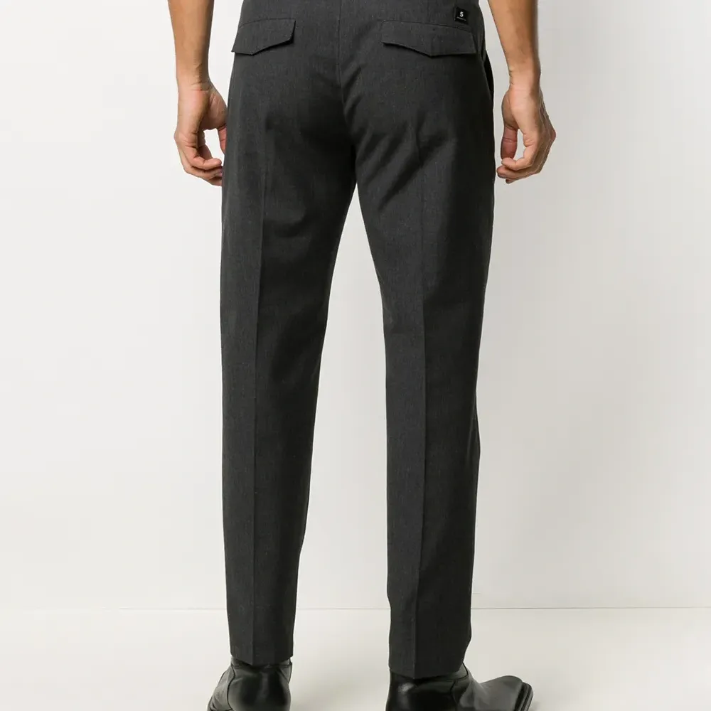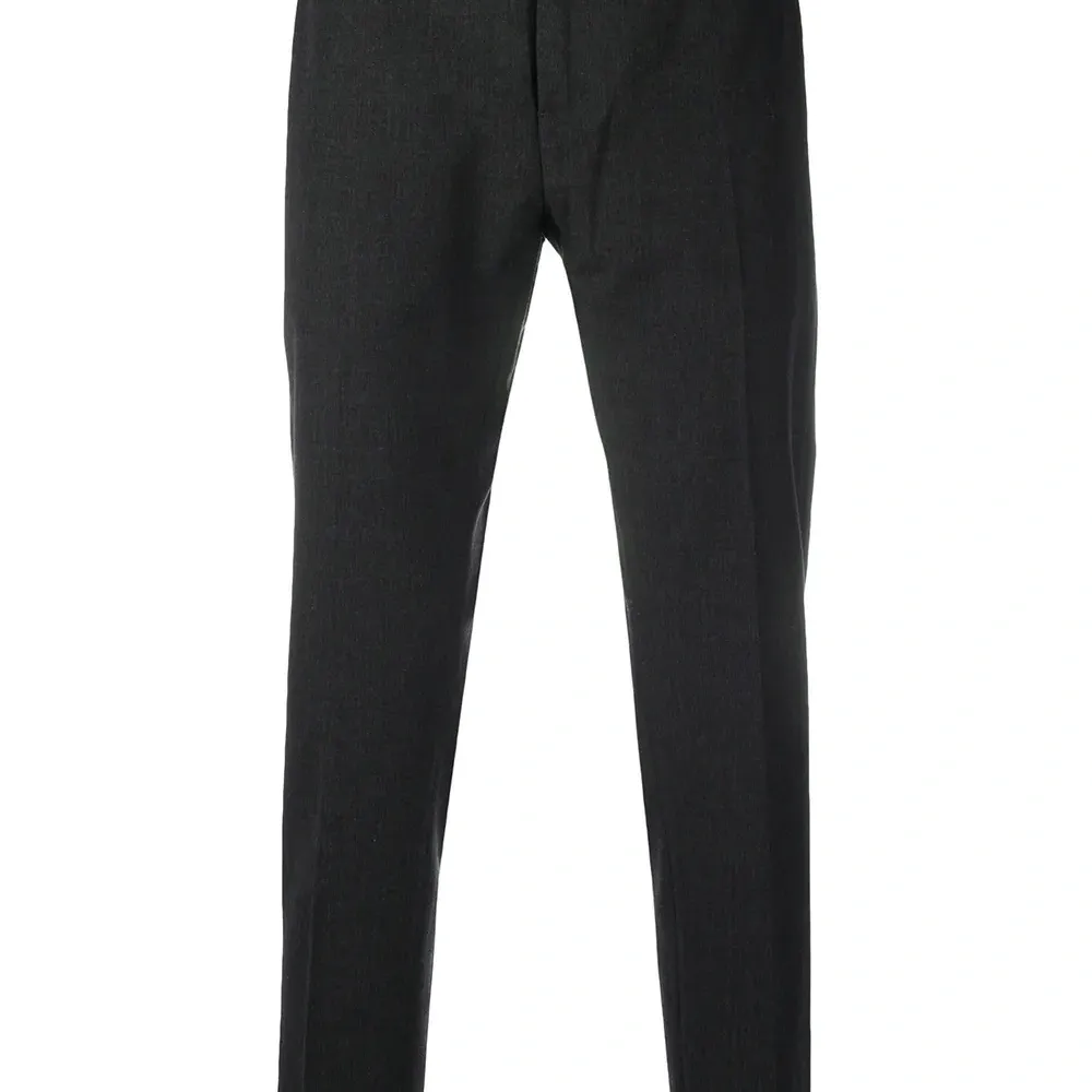 Петли для ремня, застежка на молнии и пуговице спереди и узкий крой.