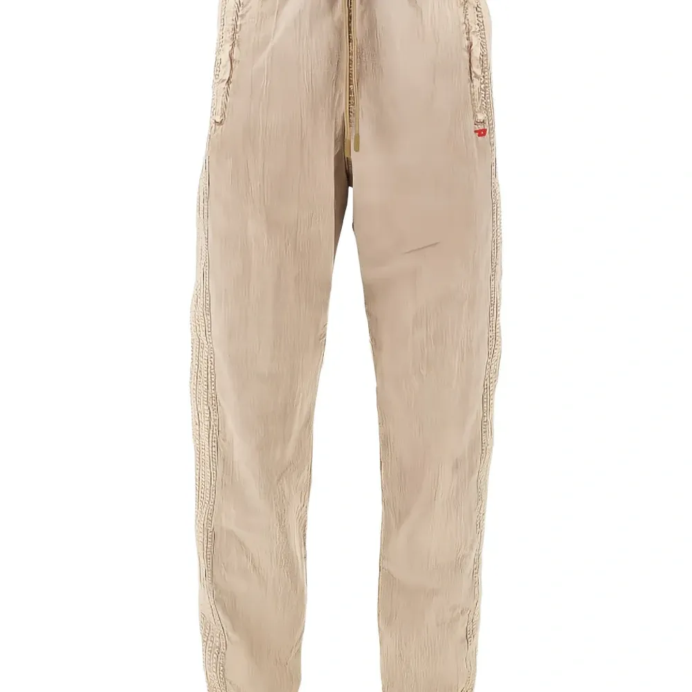 бежевый цвет, застежка на шнурке, боковая полоска, вышитый логотип, два боковых прорезных кармана, эластичные манжеты