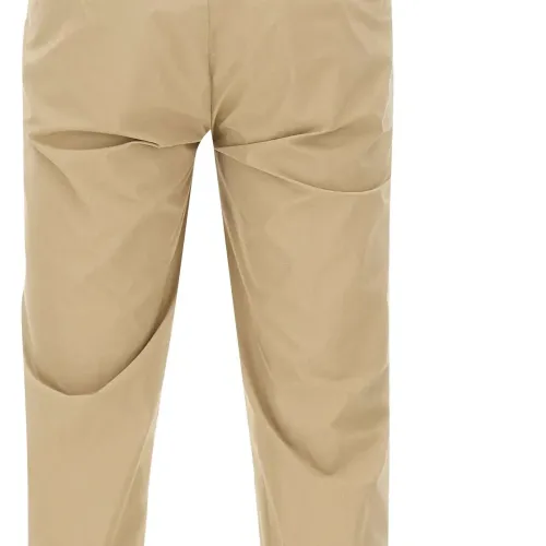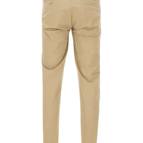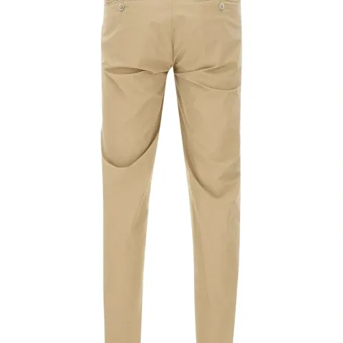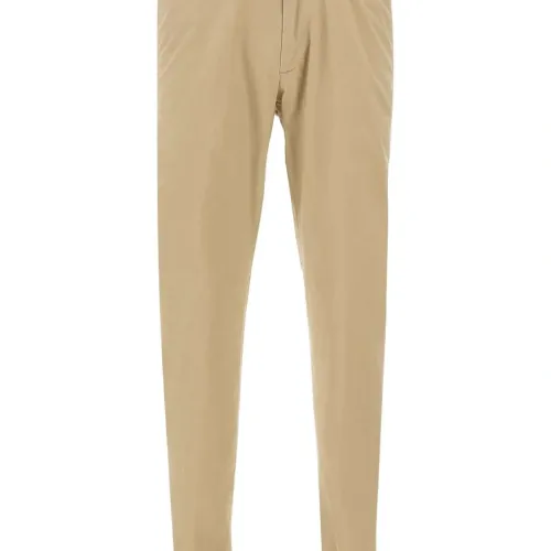 светло-коричневые шлевки для ремня, мини-логотип, прорезные карманы, застёгивающиеся сзади карманы, отворот 2,5 см
