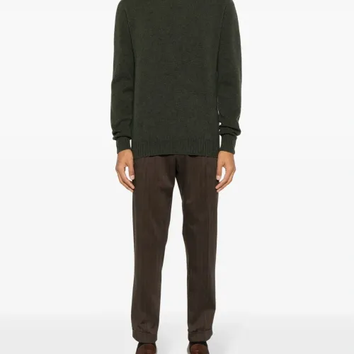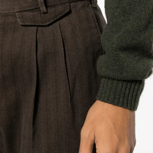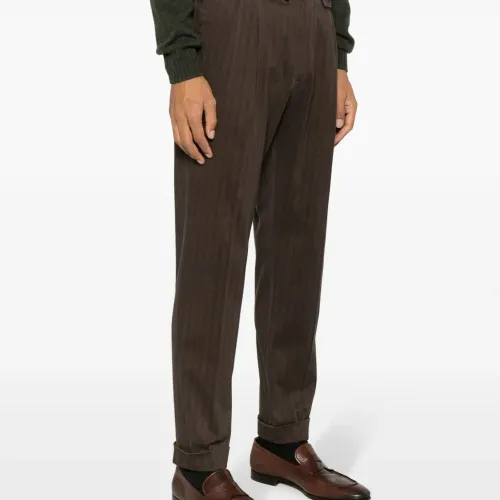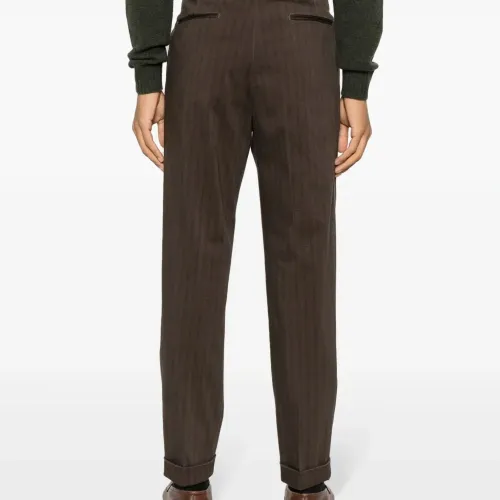 Кофейный, черный, эластичный хлопок, принт в елочку, складки, петли для ремня, смещенная застежка на пуговицах спереди, зауженный крой, два прорезных кармана по бокам, два прорезных кармана сзади и подвернутые манжеты.