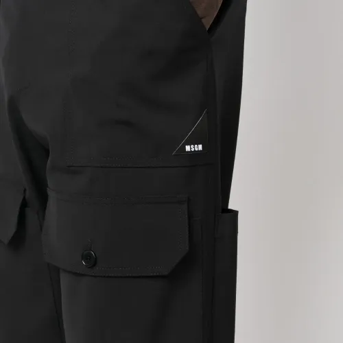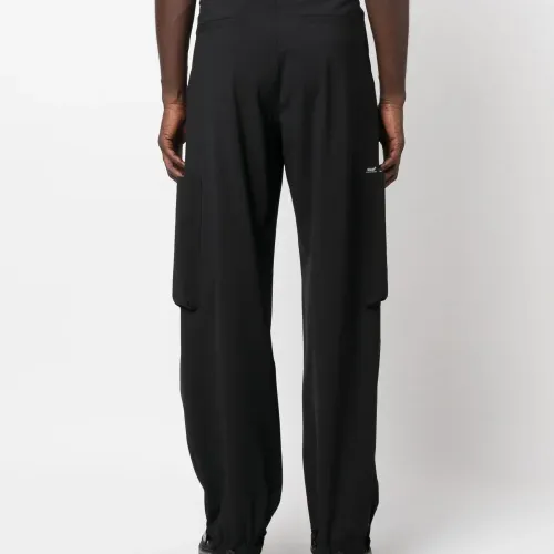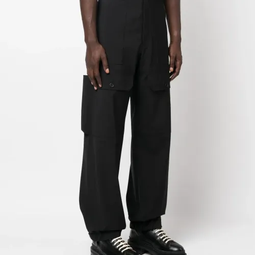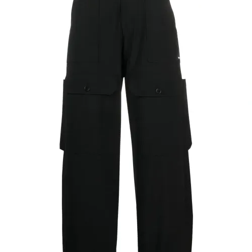 Черный, необработанная шерсть, завышенная талия, петли для ремня, застежка на пуговицах спереди, широкий крой, передние карманы с клапаном, два прорезных кармана по бокам и два накладных кармана сзади.