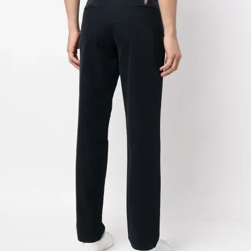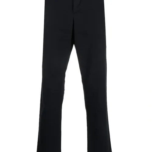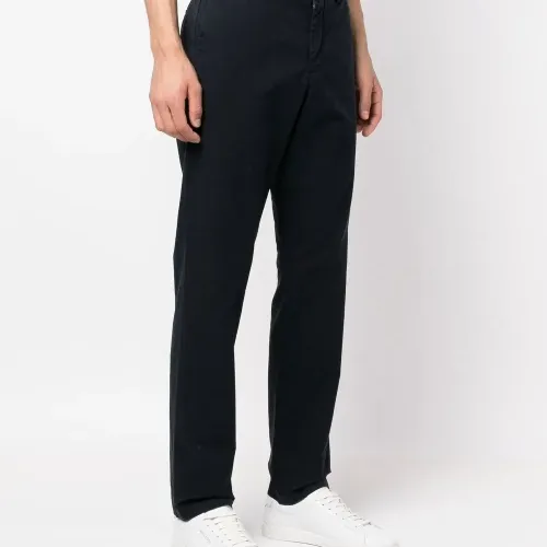 Темно-синий, смесовый органический хлопок, средняя посадка, застежка на молнии и пуговице спереди, петли для ремня, два прорезных кармана по бокам, два кармана с листочкой сзади и прямой крой.