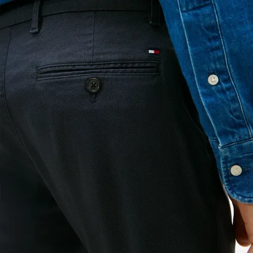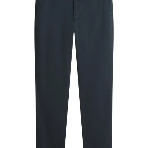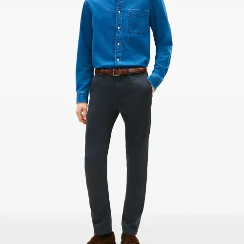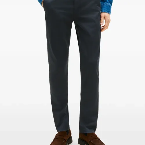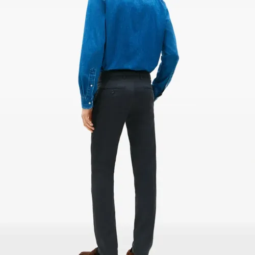 темно-синие брюки с пуговицами, шлевками для ремня и задним прорезным карманом