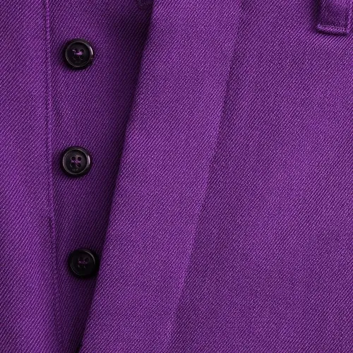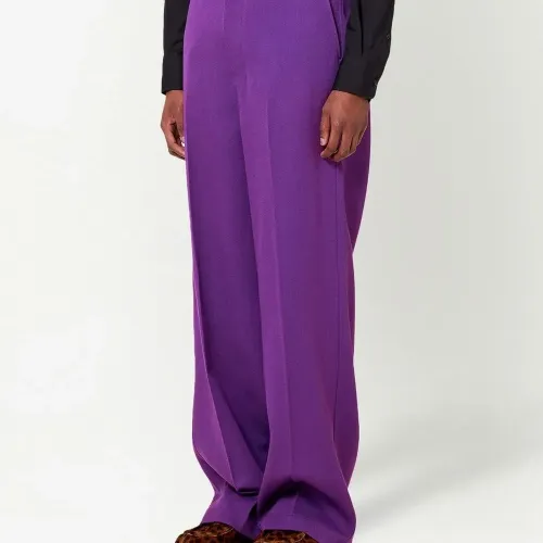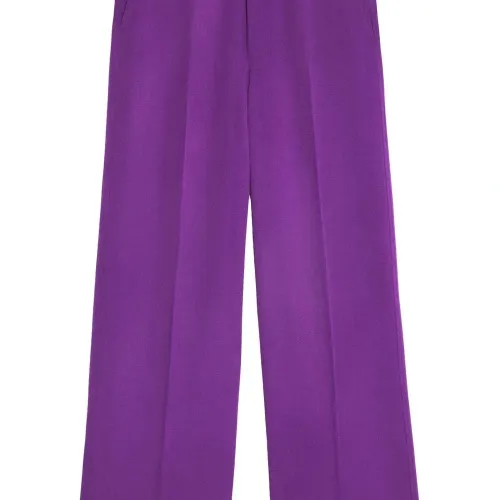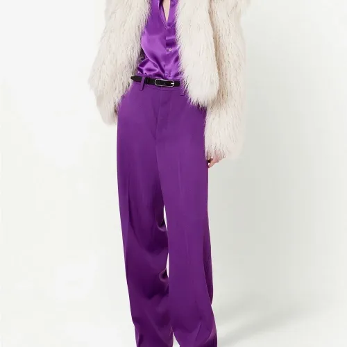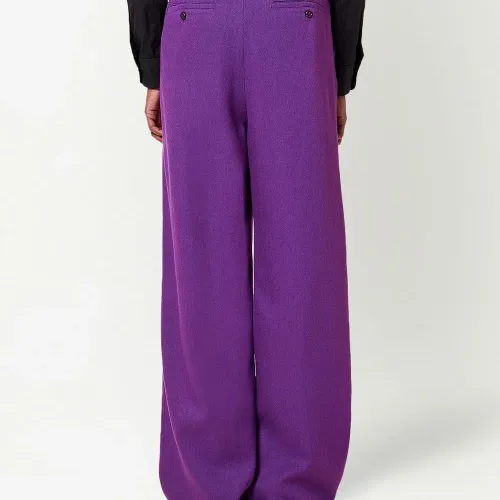 Петли для ремня, потайная застежка спереди, два вшитых кармана по бокам и два кармана на пуговице сзади. Цвет: фиолетовый.