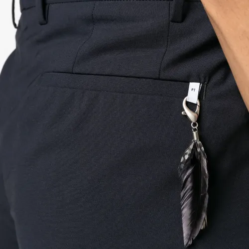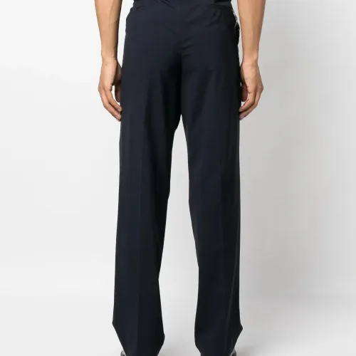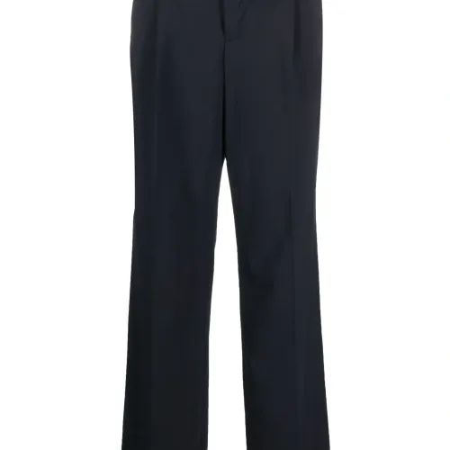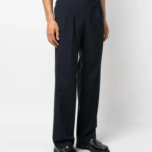 Темно-синий, смесовая необработанная шерсть, складки, крепление для ключей, прямой крой, завышенная талия, потайная застежка на молнии и пуговицах, петли для ремня, два прорезных кармана по бокам, два кармана с листочкой сзади и стрелки.