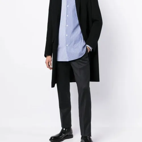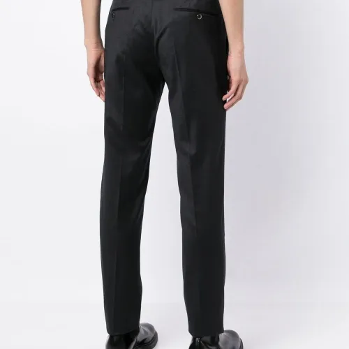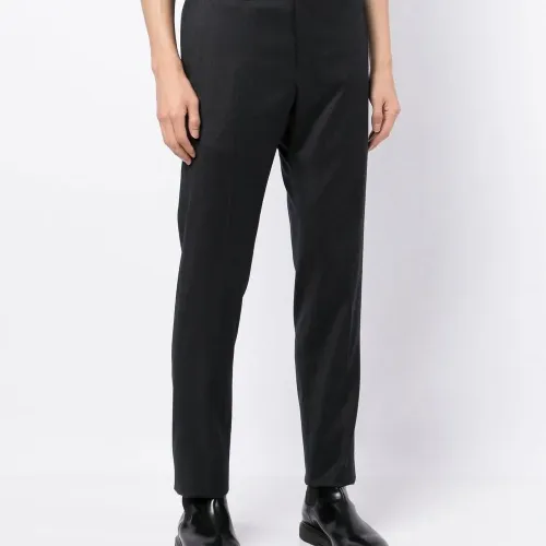 Черный, смесовая необработанная шерсть, эластичная шерсть, потайная молния спереди, застежка на пуговицы, петли для ремня, два прорезных кармана по бокам, два прорезных кармана на пуговицах сзади и узкий крой.