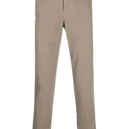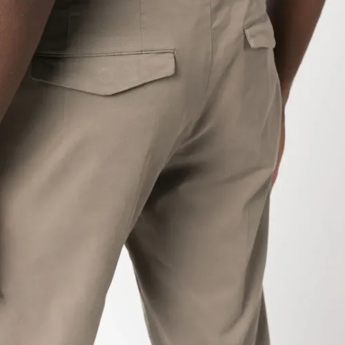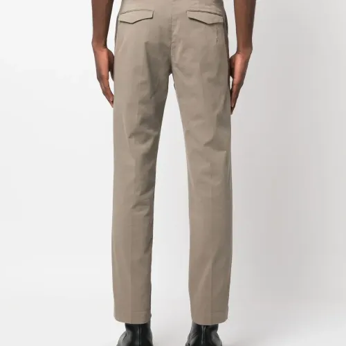 Серо-коричневый, эластичный хлопок, классический крой, стрелки, петли для ремня, смещенная застежка спереди, прямой крой, два вшитых кармана по бокам и два кармана с клапанами сзади.