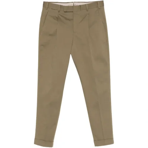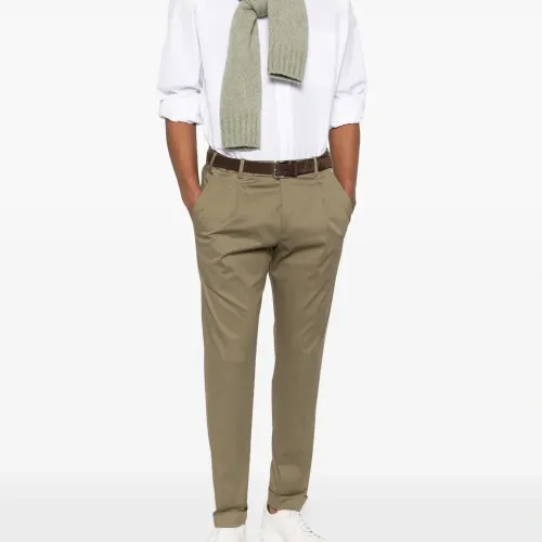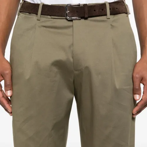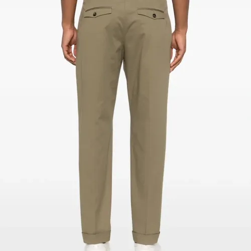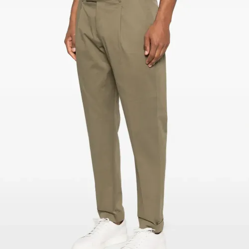 зелёные брюки с подворотами, шлевками для ремня, складками, боковыми косыми карманами и задними карманами с клапанами