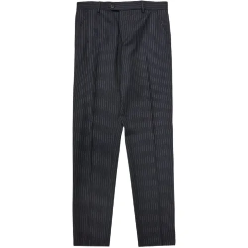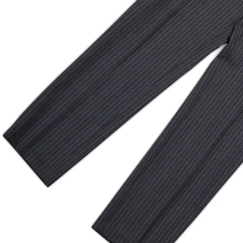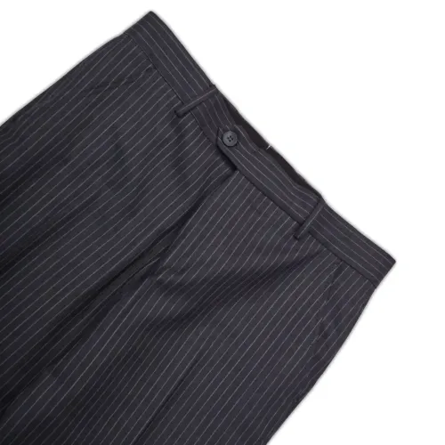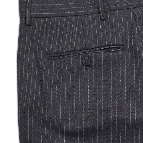 серые брюки в тонкую полоску с пуговицей на заднем кармане