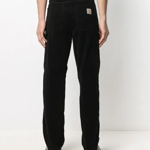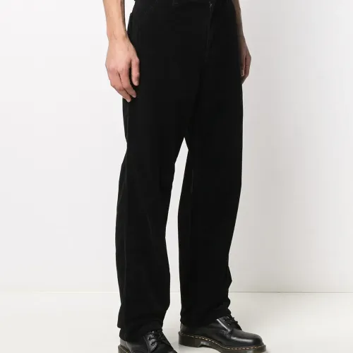 Вельветовый материал, нашивка с логотипом сзади, петли для ремня, завышенная талия, застежка на молнии и пуговице спереди, прямой крой, два накладных кармана сзади и два прорезных кармана по бокам. Цвет: черный.