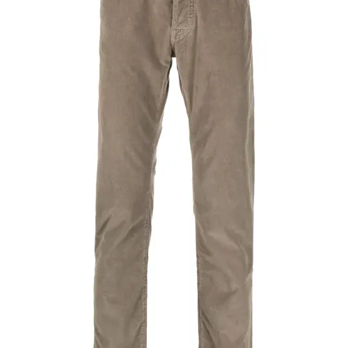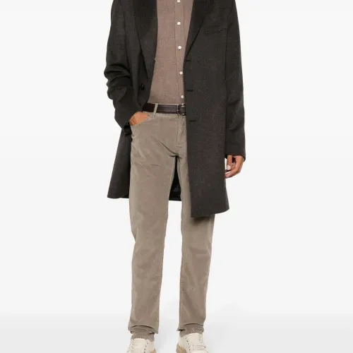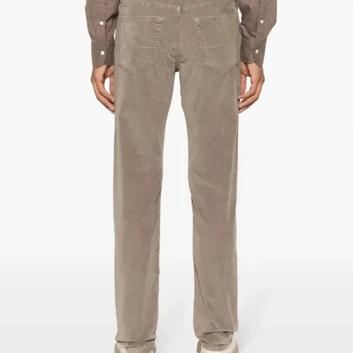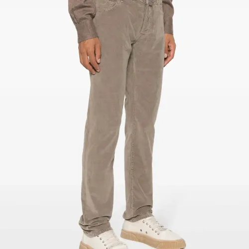 Бежевый, смесовый хлопок, деним, нашивка с логотипом сзади, потайная застежка на молнии и пуговицах, пять карманов, петли для ремня, средняя посадка, зауженный крой и прямой подол.