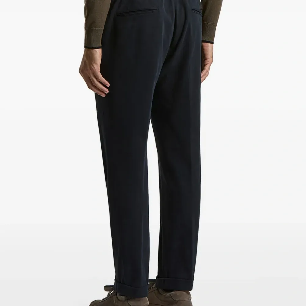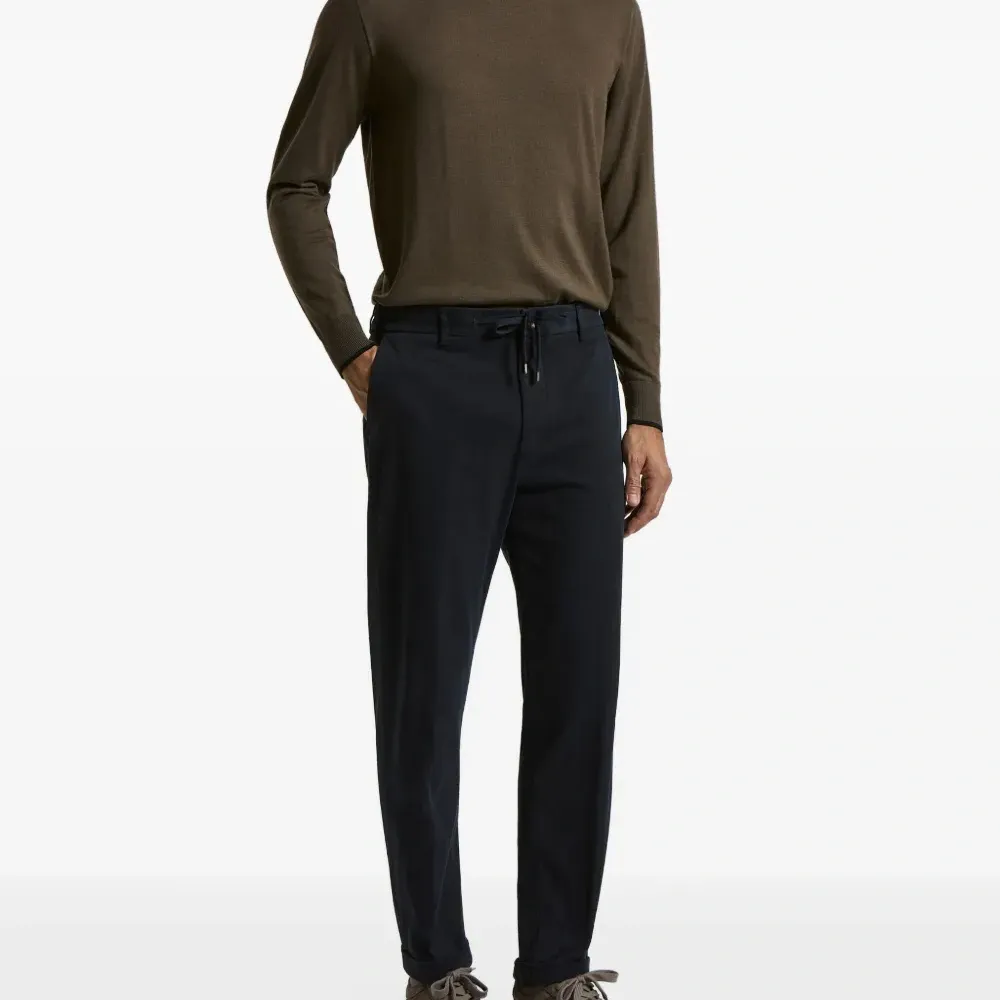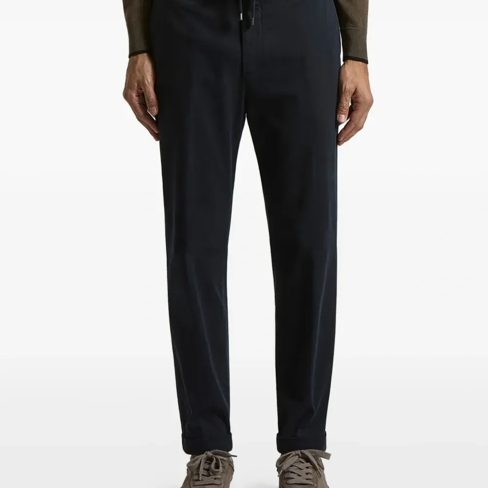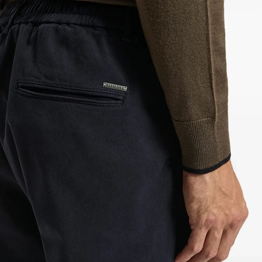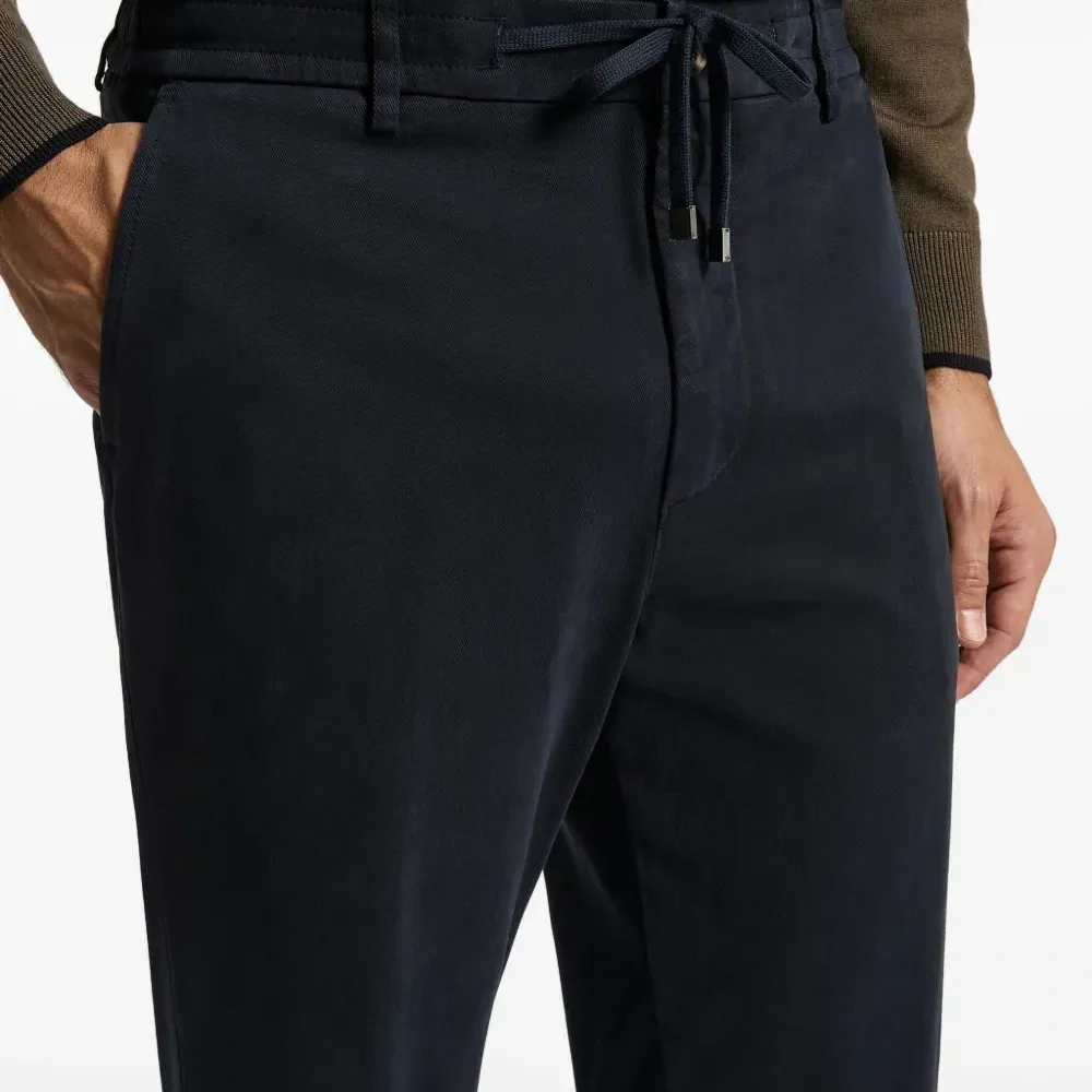 синий цвет, завязка на шнурке, шлёвки для пояса, планка с логотипом, подвернутый край, задние прорезные карманы