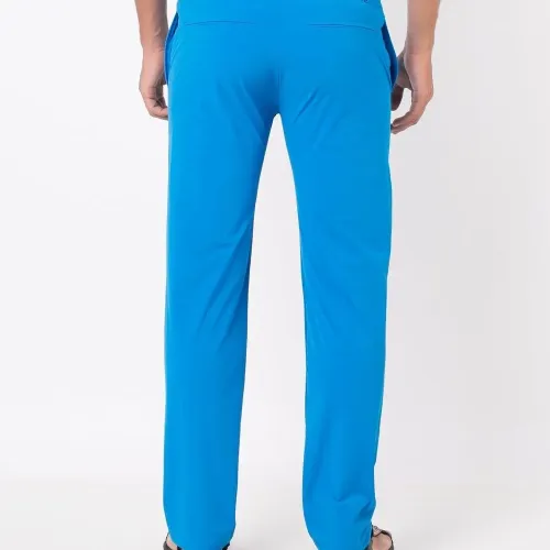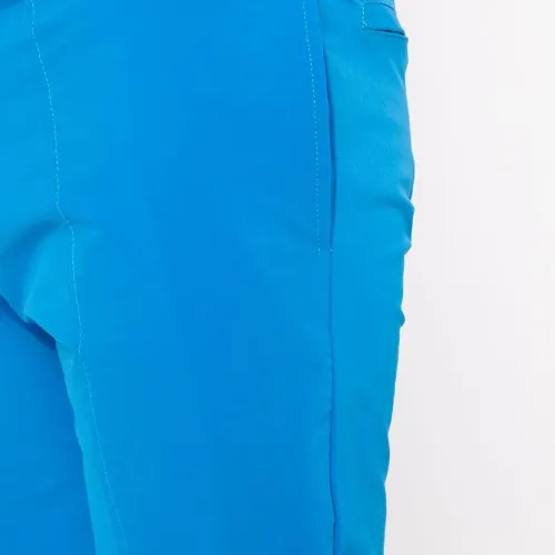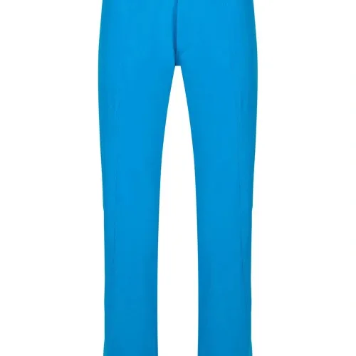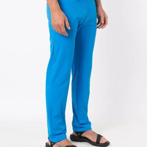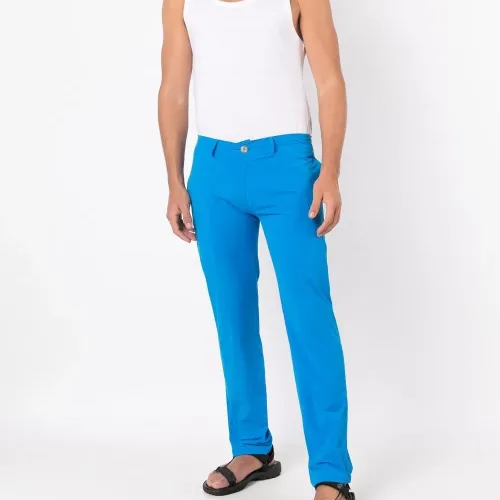Синий, петли для ремня, потайная молния спереди, два прорезных кармана по бокам, два кармана с листочкой сзади, узкий крой и низкая посадка.