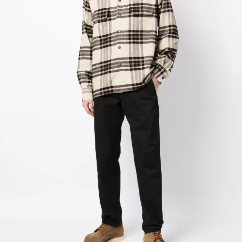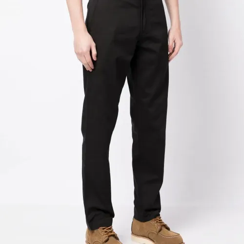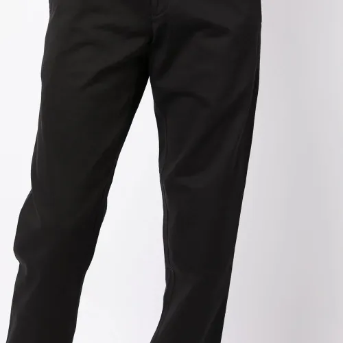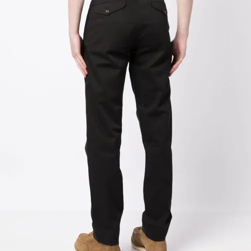 Черный, хлопок, петли для ремня, застежка на молнии и пуговице спереди, узкий крой, два прорезных кармана по бокам и два кармана с клапанами сзади.
