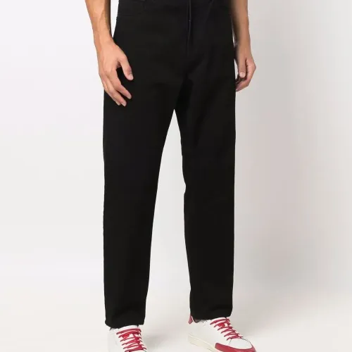 Средняя посадка, прямой крой, застежка на пуговицы и классическая пятикарманная модель. .