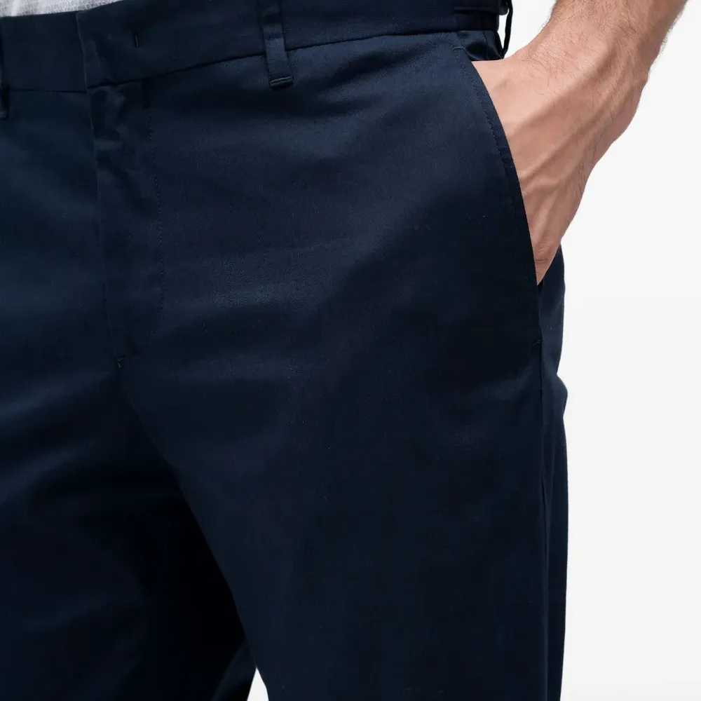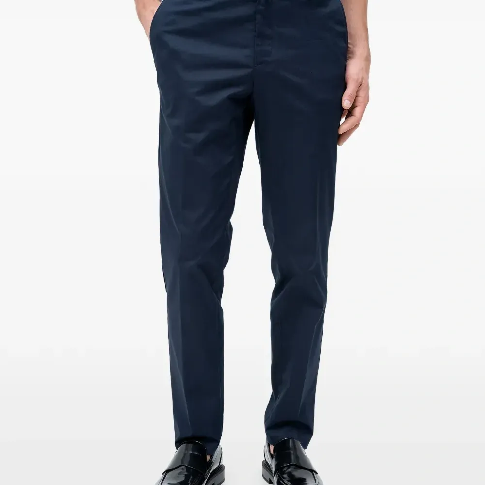 тёмно-синие шлевки на поясе, боковые карманы с разрезами, задние прорезные карманы, скрытая застёжка
