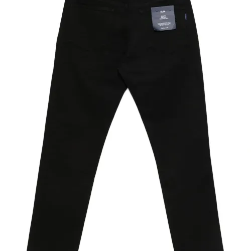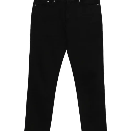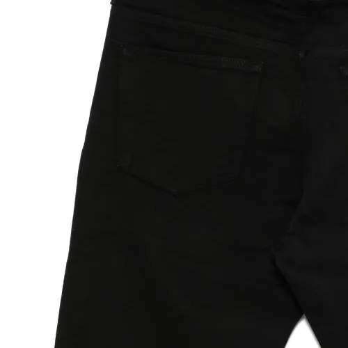 черная деталь с логотипом, шлевки для ремня, пять карманов, застежка на верхнюю пуговицу, застежка-молния