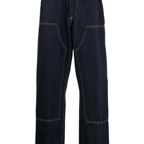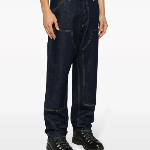 Индиго, хлопок, деним, нашивка с логотипом сзади, завышенная талия, петли для ремня, застежка на молнии и пуговице спереди, прямой крой, два накладных кармана по бокам, два накладных кармана сзади и прямой подол.