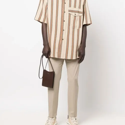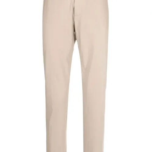 Средняя посадка, петли для ремня, застежка на молнии и пуговице спереди, два вшитых кармана по бокам, два кармана с клапанами сзади и узкий крой.