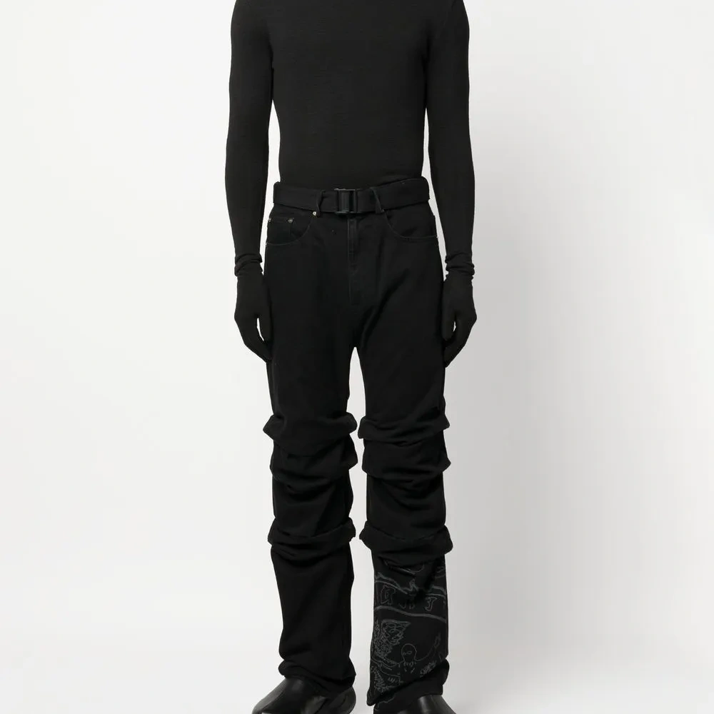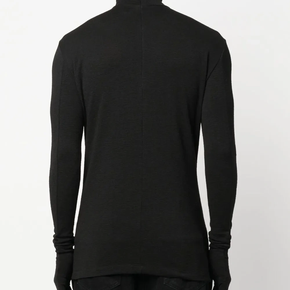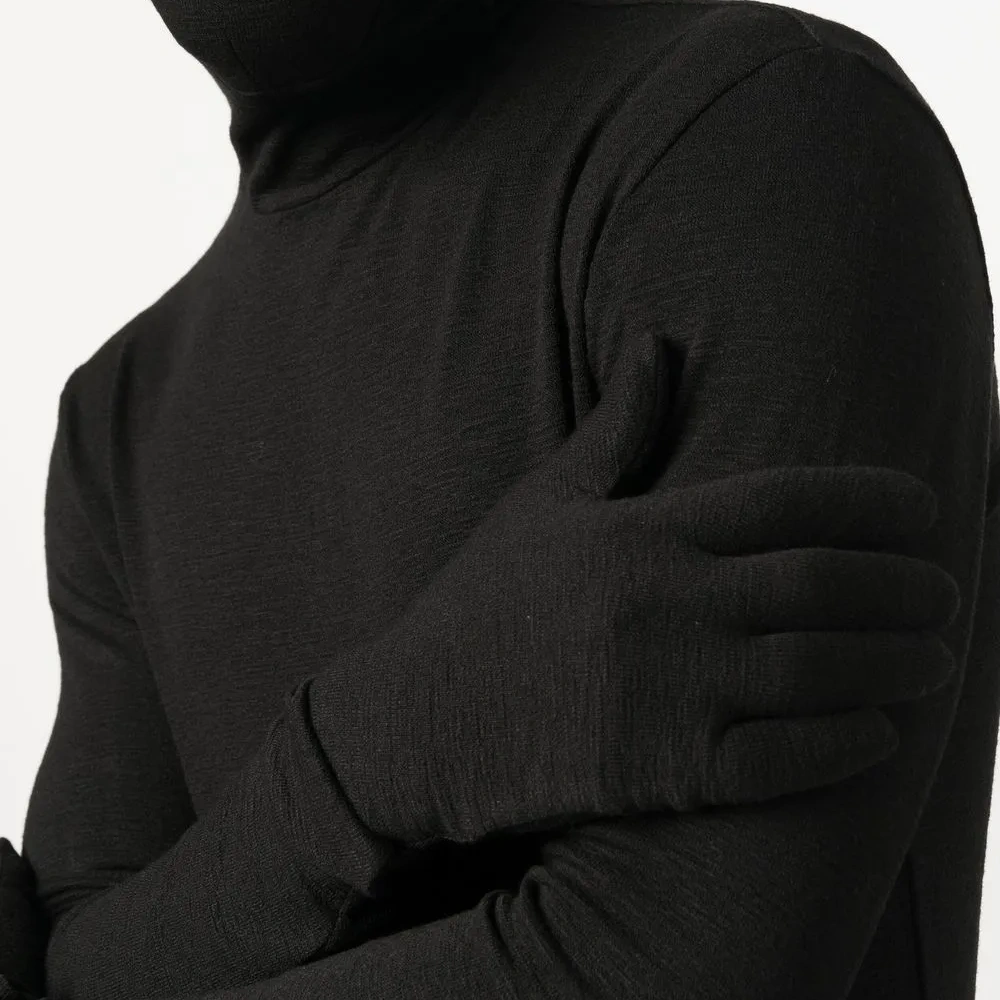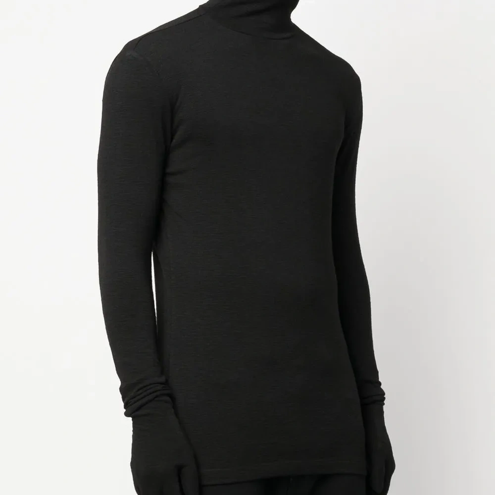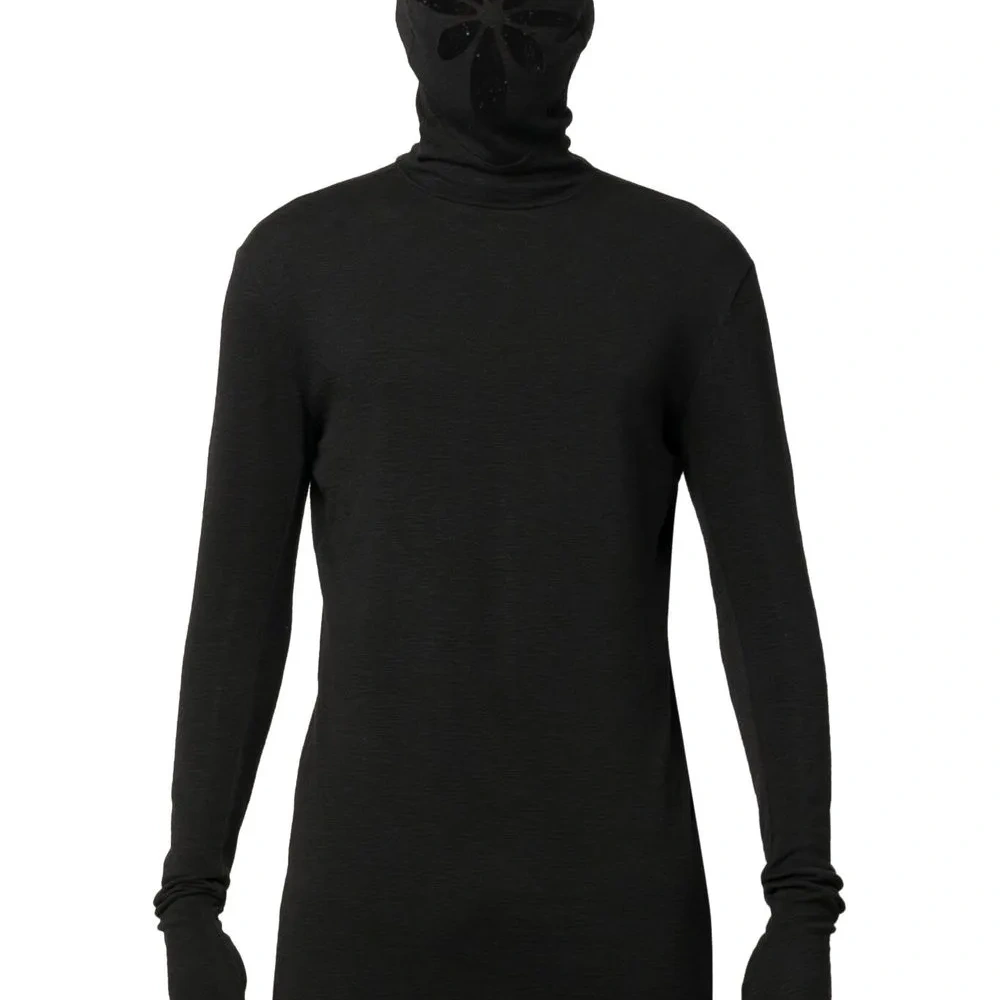 Черный, эластичный материал, вырезные детали в форме цветов, рукава-перчатки и застежка на молнии сзади.