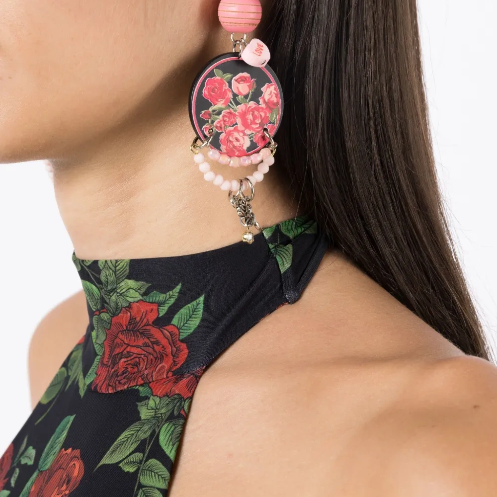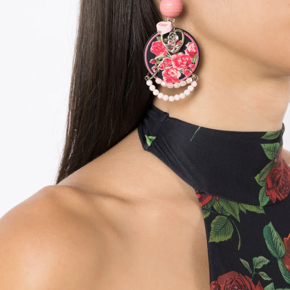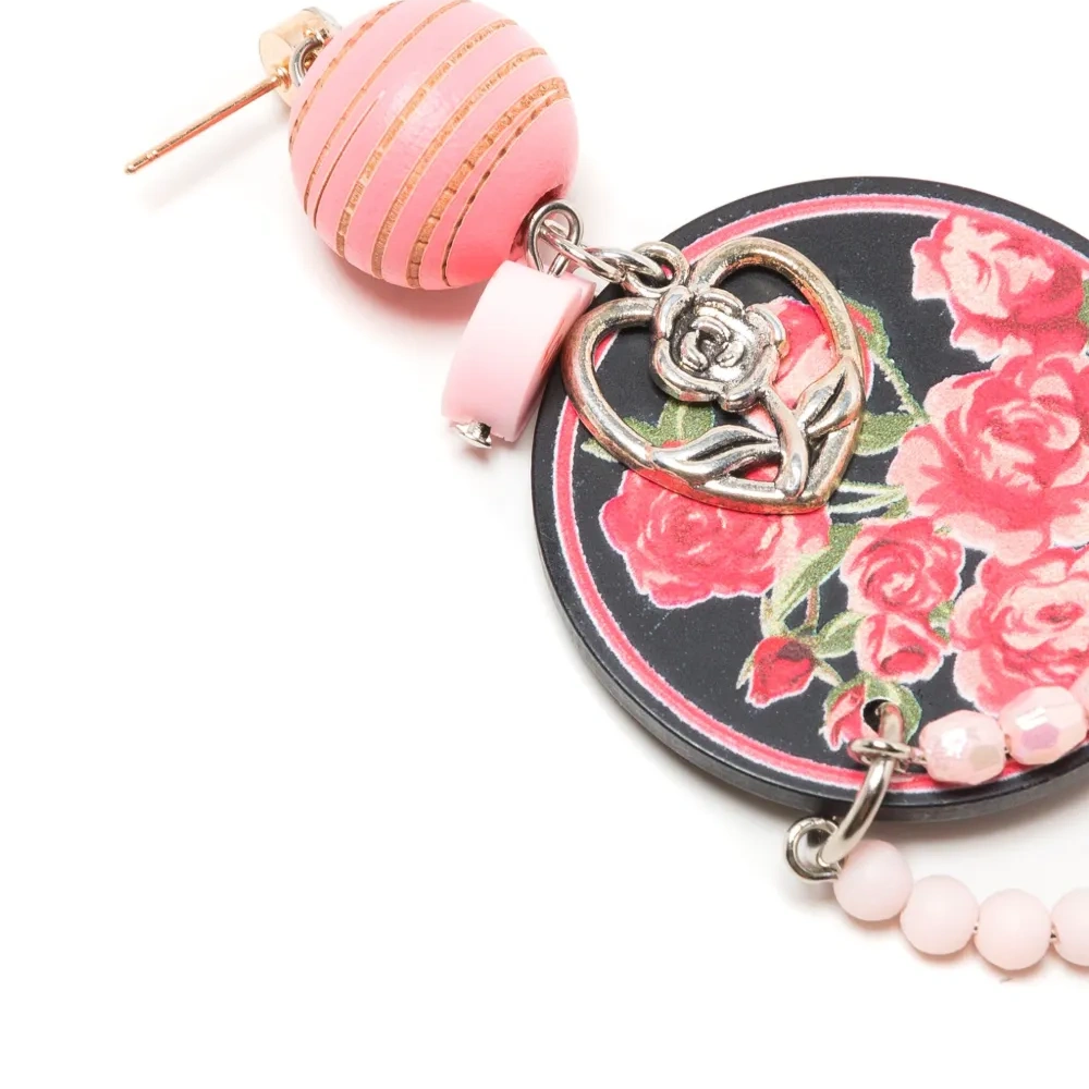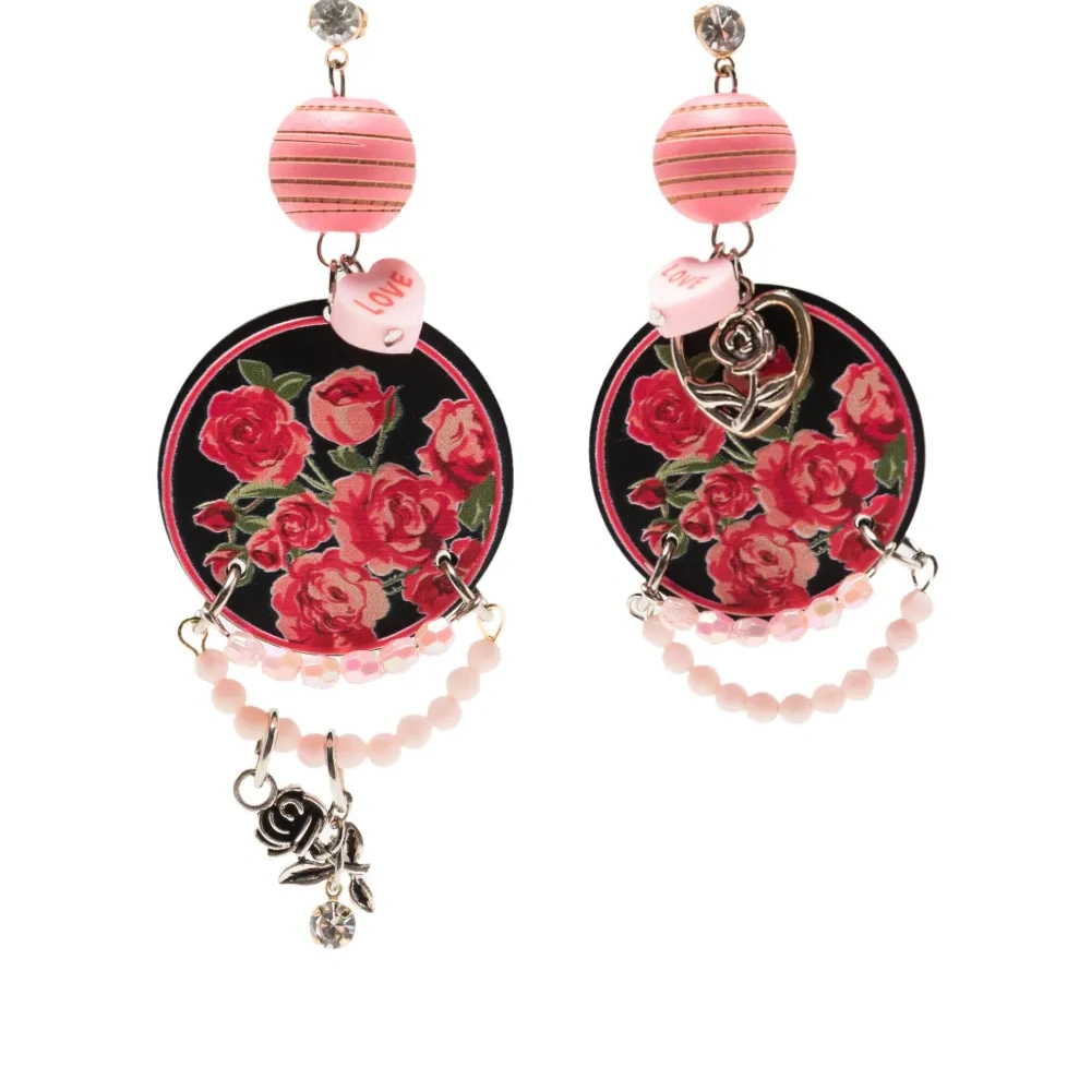Асимметричная форма, серебристая фурнитура, декор из кристаллов, цветочный принт, декор из искусственного жемчуга, подвеска в форме сердца, подвеска в форме цветка и застежка-штифт. В комплект входят две серьги.