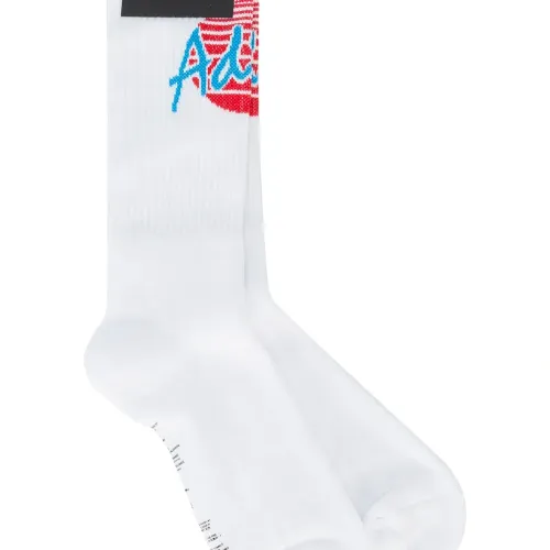 Белые носки из эластичного хлопкового микса с вывязанными красно-синими изображениями 'Adios' от Palm Angels. Верх в рубчик, вставки с фирменным сезонным слоганом на щиколотках, небольшие принты на подошвах. Чулочно-носочные изделия должны быть возвращены в закрытой оригинальной упаковке.