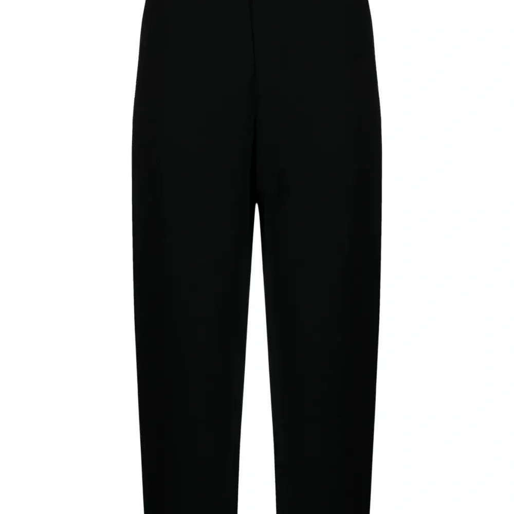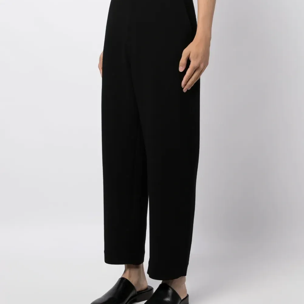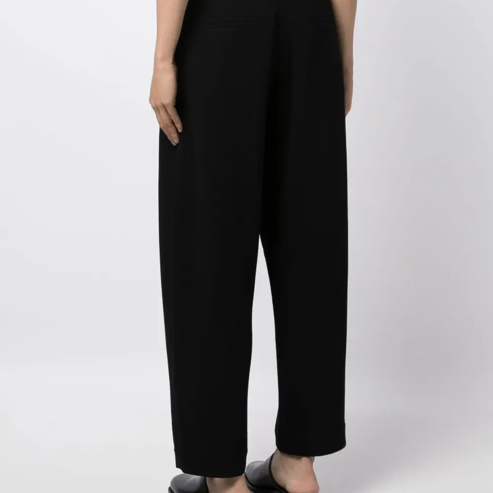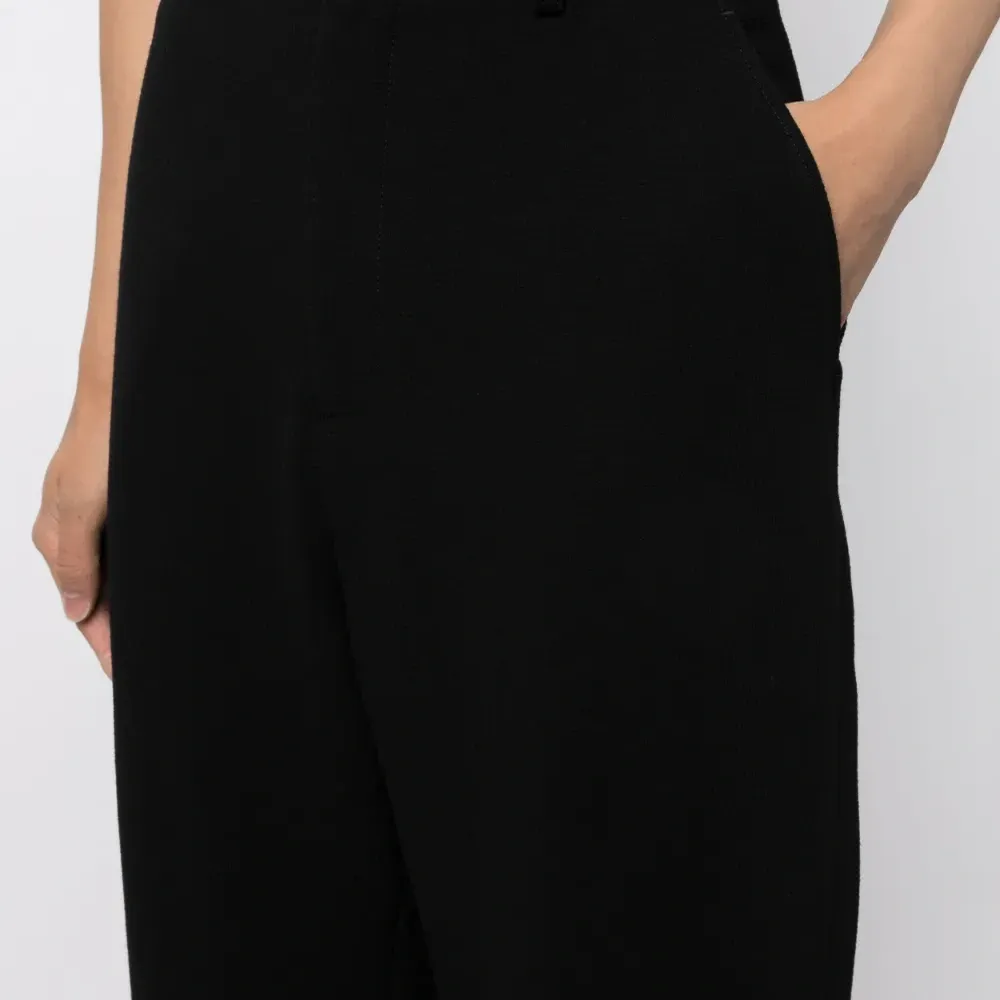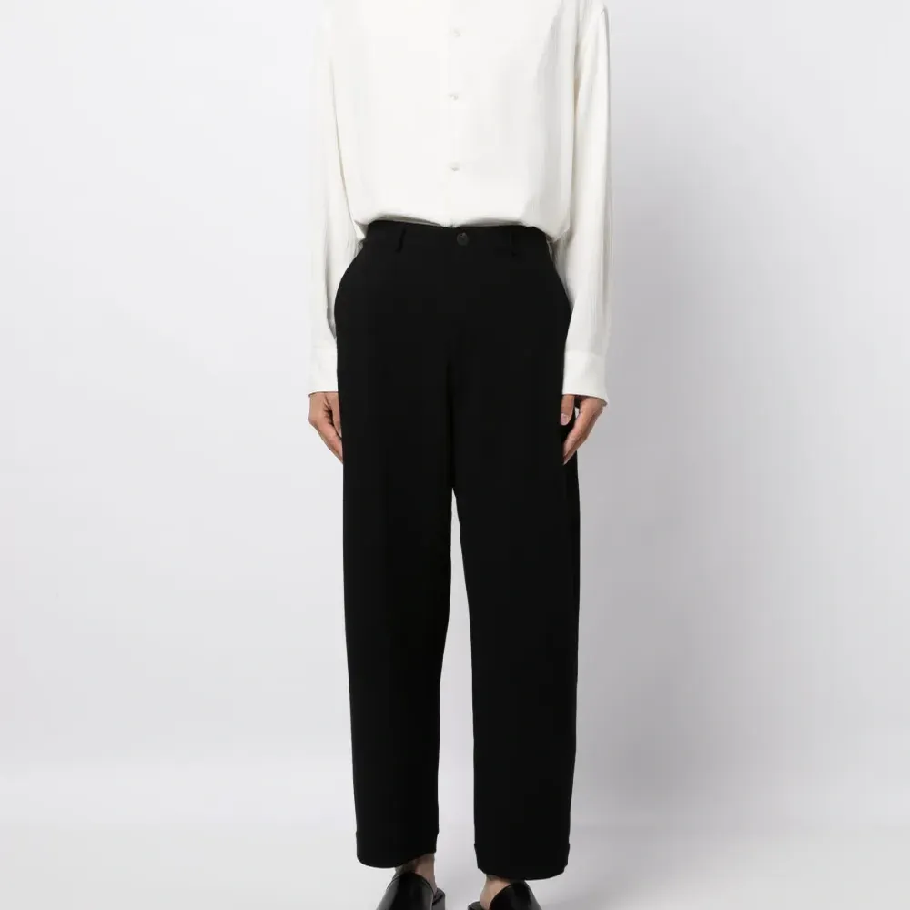 Черный, смесовая необработанная шерсть, потайная застежка на молнии и пуговицах, два вшитых кармана по бокам, два прорезных кармана сзади, средняя посадка, прямой крой и прямой подол.