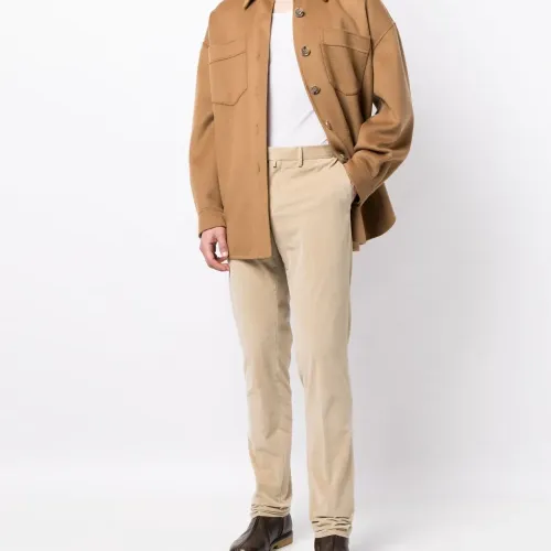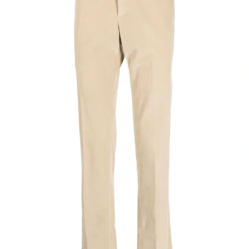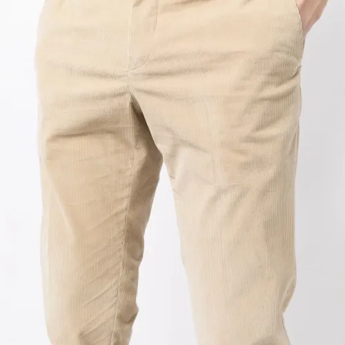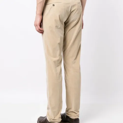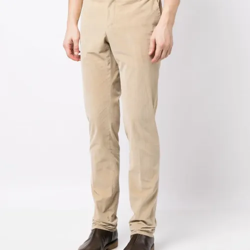 Песочно-бежевый, эластичный хлопок, вельветовый материал, петли для ремня, смещенная застежка на пуговицах спереди, два прорезных кармана по бокам, два прорезных кармана на пуговицах сзади и зауженный крой.