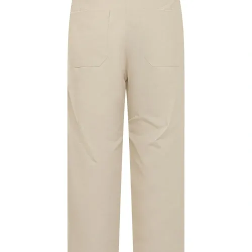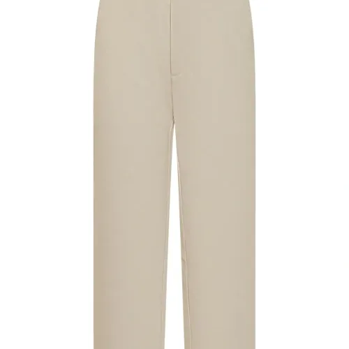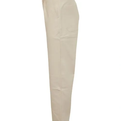 кремовые шлевки для ремня, застёжка на пуговицу, задние накладные карманы, узкие брючины