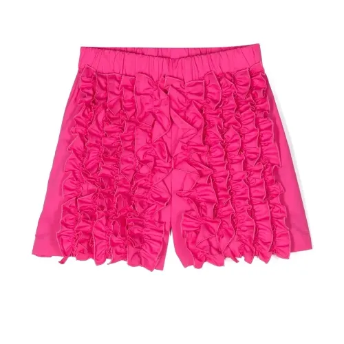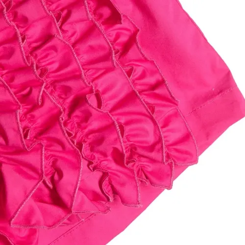 Фуксия, вышитый логотип сзади, детали с оборками, эластичный пояс и длина до бедер.