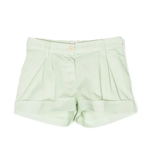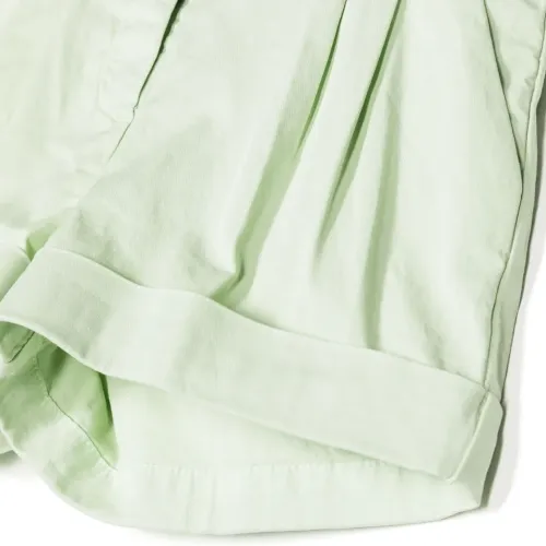 Светло-зеленый, эластичный хлопок, складки, петли для ремня, застежка на молнии и пуговице спереди, эластичный пояс сзади, два кармана по бокам и подвернутые манжеты.