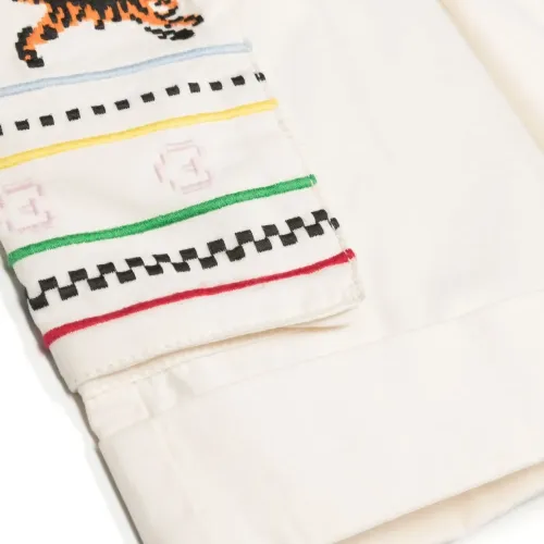 Цвет слоновой кости, хлопок, вышивка, потайная застежка на молнии и пуговицах, карман с клапаном сбоку, два кармана с клапанами по бокам, петли для ремня и прямой подол.