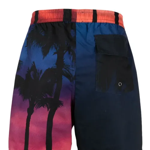 Темно-синий, разноцветный, принт с изображением пальм, кулиска на талии и карман с клапаном сзади. Пожалуйста, примеряйте купальники и пляжные шорты только поверх собственного белья.