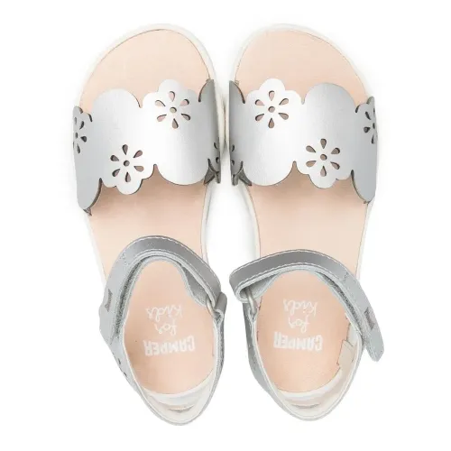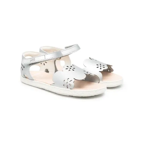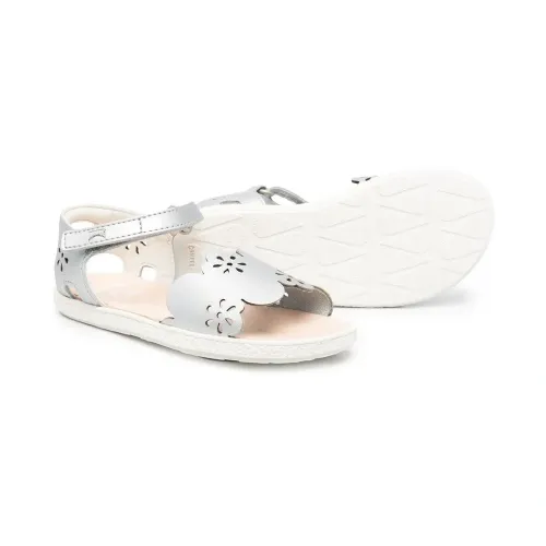 Серебристый, телячья кожа, покрытие с эффектом металлик, вырезные детали, открытый носок, застежка на липучке и плоская резиновая подошва. Кожа в составе этого товара сделана на фабрике, сертифицированной организациями Leather Working Group (LWG) или ICEC. Это гарантирует, что производитель минимизировал негативное влияние материала на окружающую среду. Узнать больше о том, какие товары получают отметку «Ответственный выбор», можно из материала «Как мы оцениваем экологичность и этичность».
