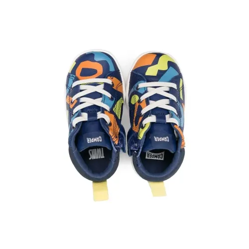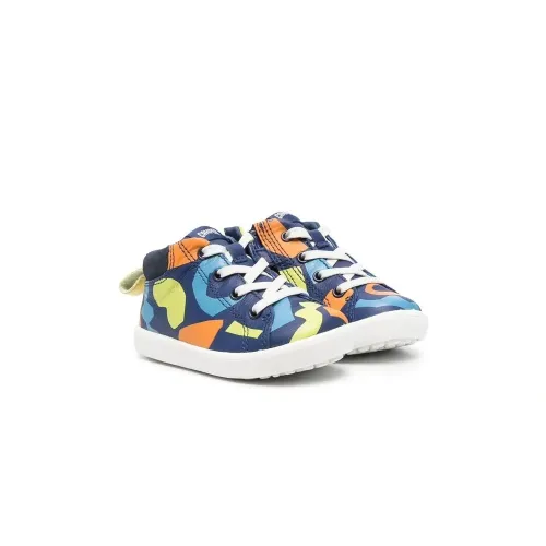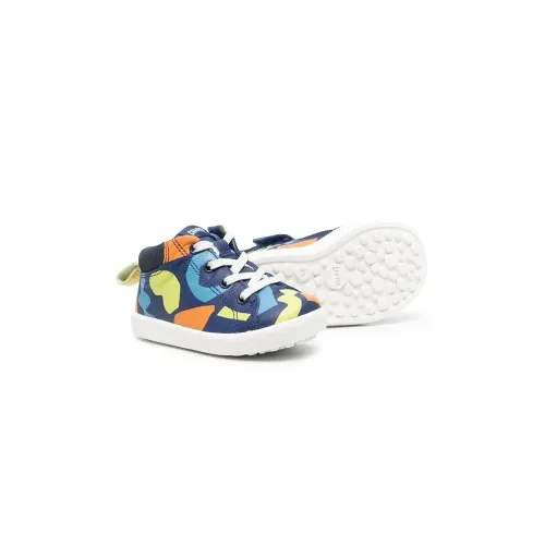 Темно-синий, разноцветный, нубук, переработанный полиэстер, абстрактный принт, нашивка с логотипом на язычке, шнуровка спереди, закругленный носок, петля для подтягивания сзади, стелька с логотипом и плоская резиновая подошва.