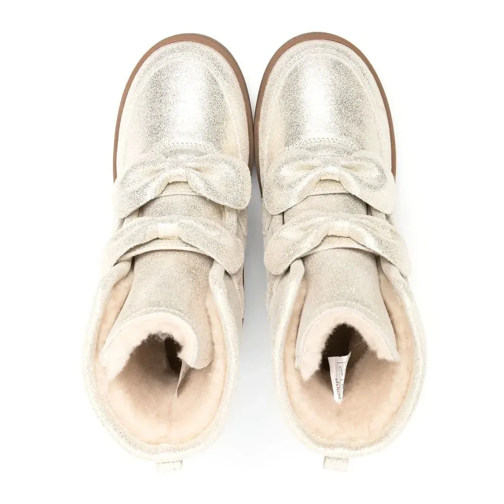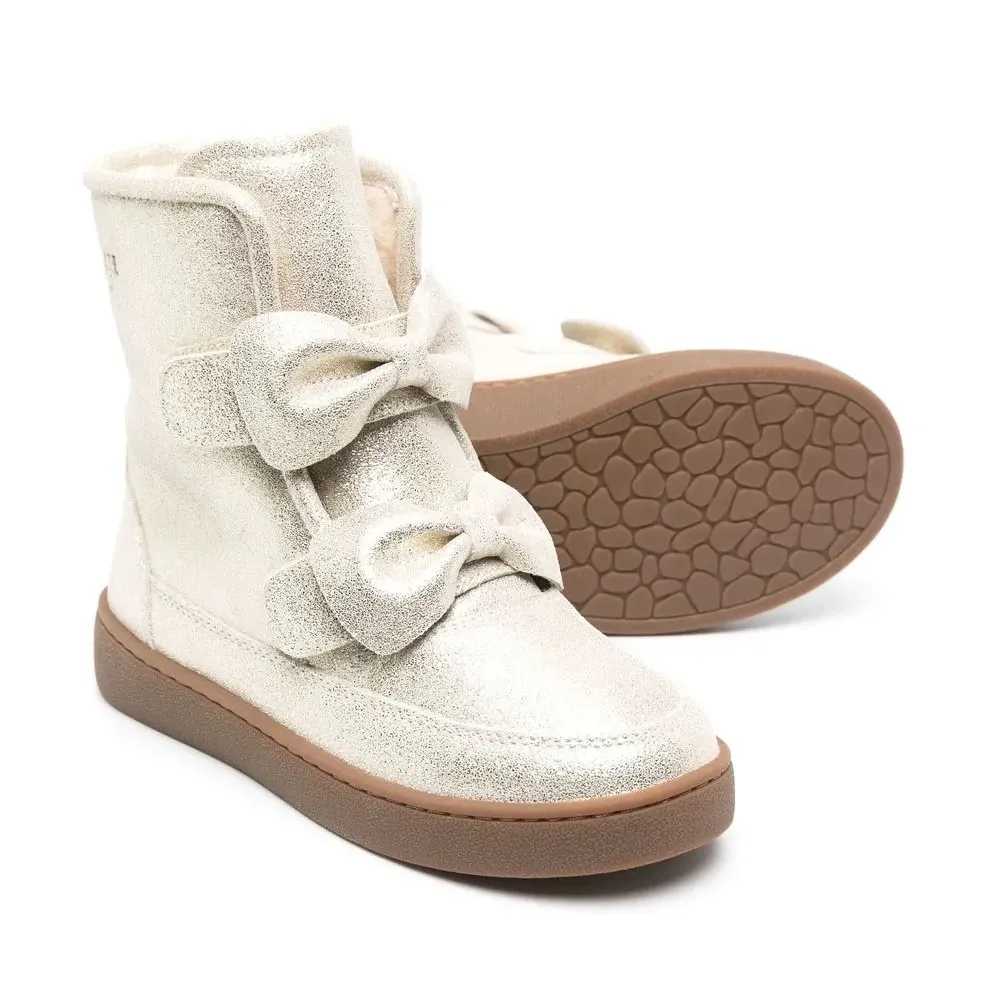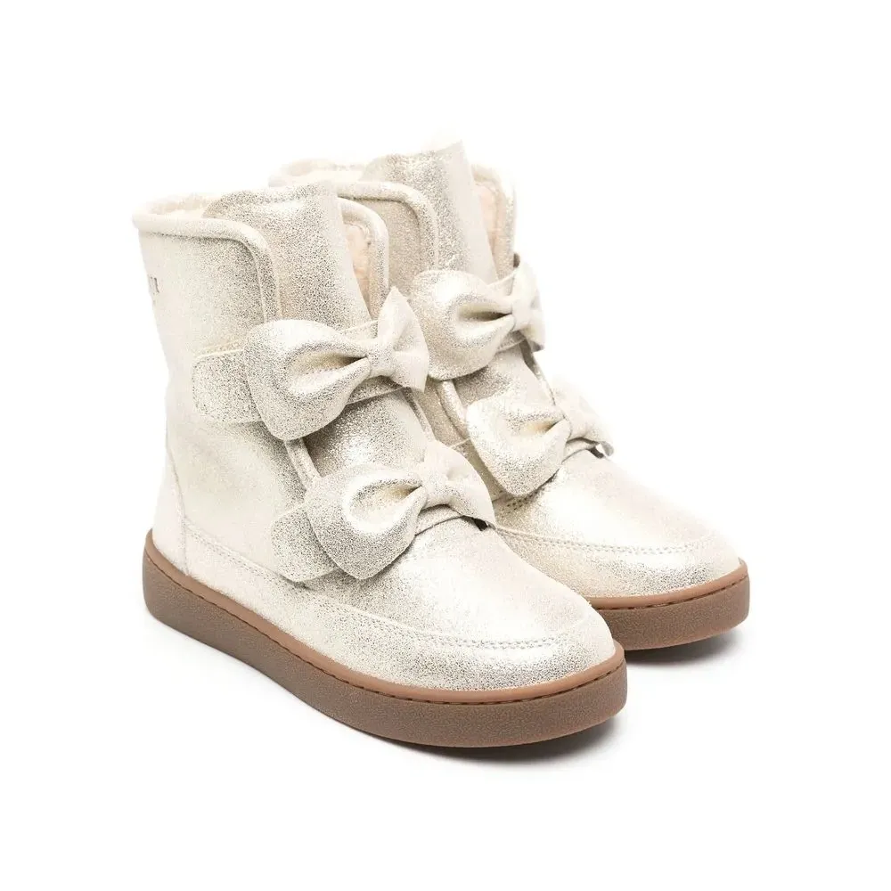 Золотистый, телячья кожа, эффект металлик, бант, закругленный носок, застежка на липучке спереди, подкладка из шерпы, высота по щиколотку, петля для подтягивания сзади, резиновая подошва и модель без застежки.