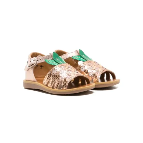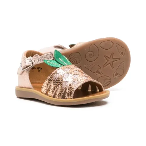Кораллово-розовый, кожа, покрытие с эффектом металлик, открытый носок, боковые застежки с пряжками, плоская резиновая подошва, стелька с логотипом и закругленный носок.