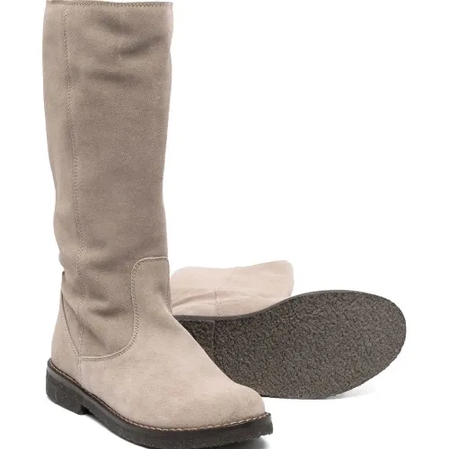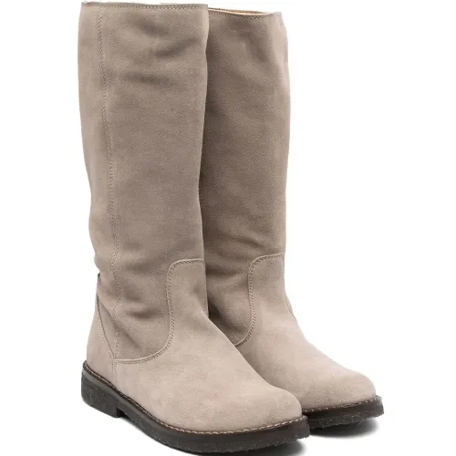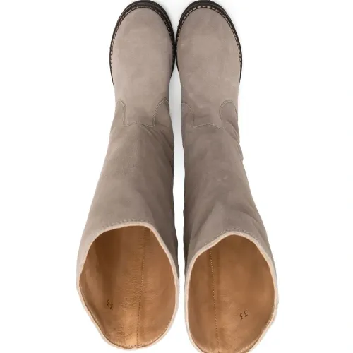 Светло-серый, телячья кожа, замша из телячьей кожи, закругленный носок, телячья кожа и плоская резиновая подошва.