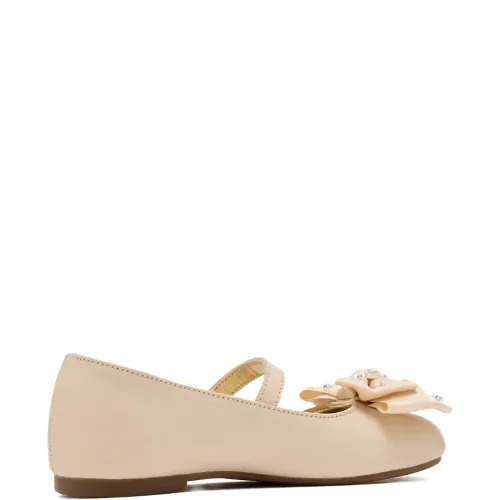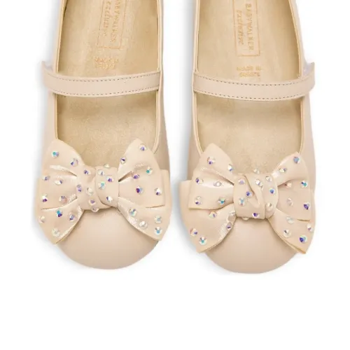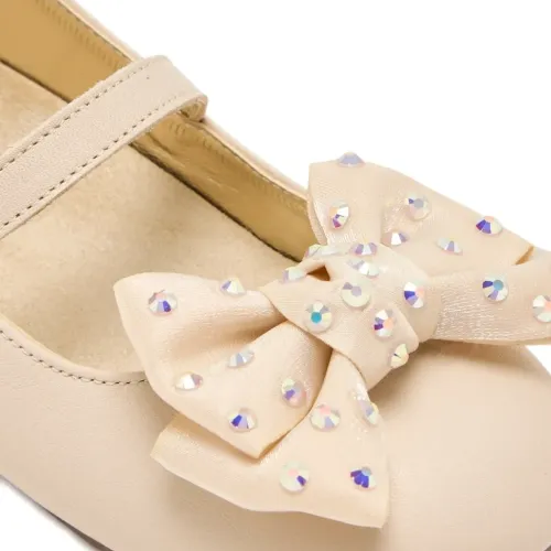 бежевые балетки с переливающимся декором, бантом, ремешком, круглым носком и плоской подошвой
