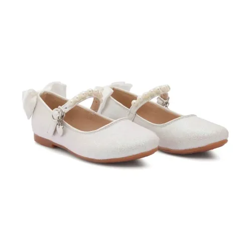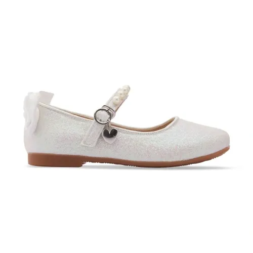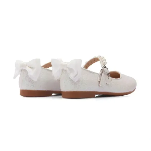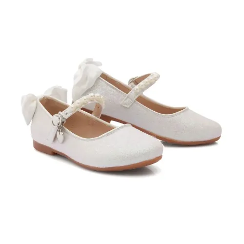 Белый, детали из бисера, бант, блестящий материал, закругленный носок, застежка с пряжкой спереди и резиновая подошва.
