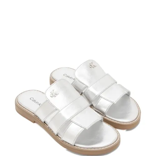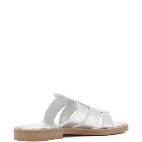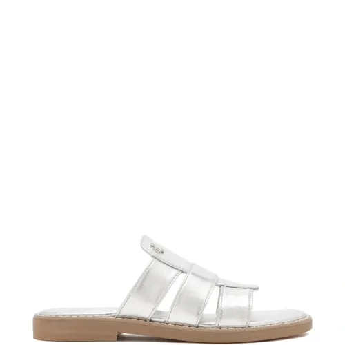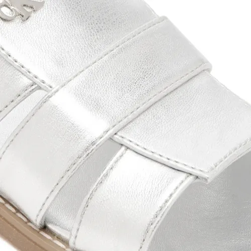 сандалии с открытым носком, украшением в виде логотипа серебристого оттенка и ремешком на плоской подошве