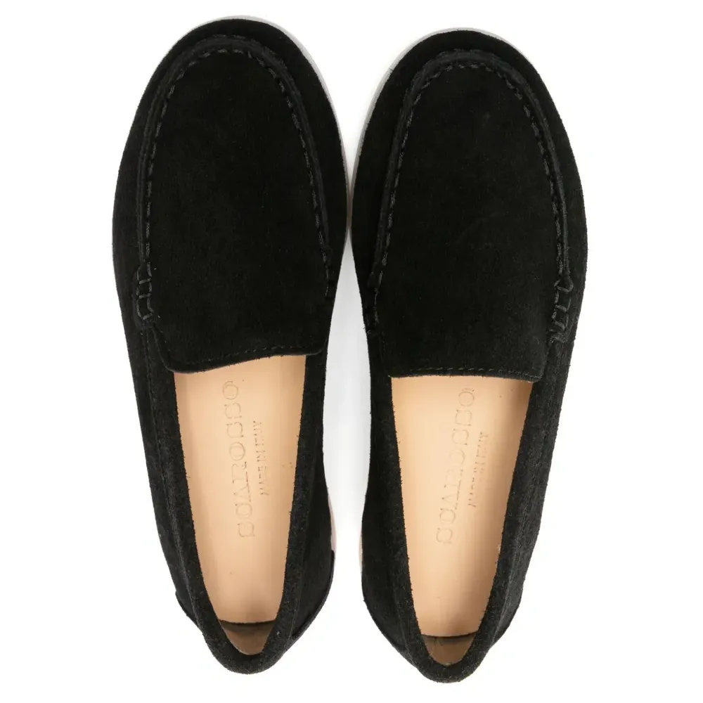 Черный, замша из телячьей кожи, строчка в тон, без эффекта утяжеления, закругленный носок, модель без застежки, кожаная стелька с логотипом, плоская резиновая подошва и низкий блочный каблук. Все товары произведены вручную.