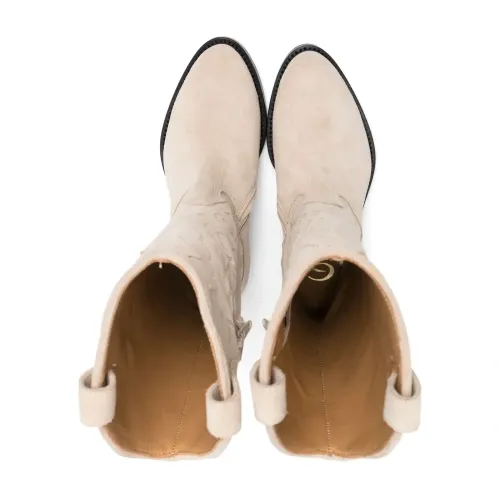 Песочно-бежевый, телячья кожа, замша из телячьей кожи, однотонная расцветка, закругленный носок, двойная петля для подтягивания, застежка на молнии сбоку, кожаная стелька с логотипом и контрастная резиновая подошва.