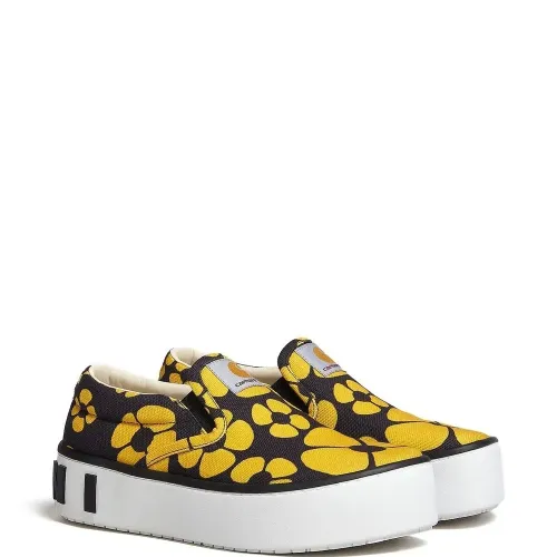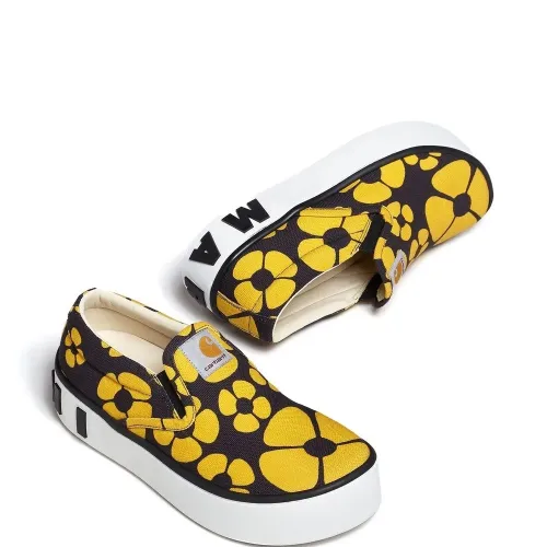 Хлопок, сплошной цветочный принт, тисненый логотип сзади, нашивка с логотипом на язычке, закругленный носок, модель без застежки и плоская резиновая подошва.