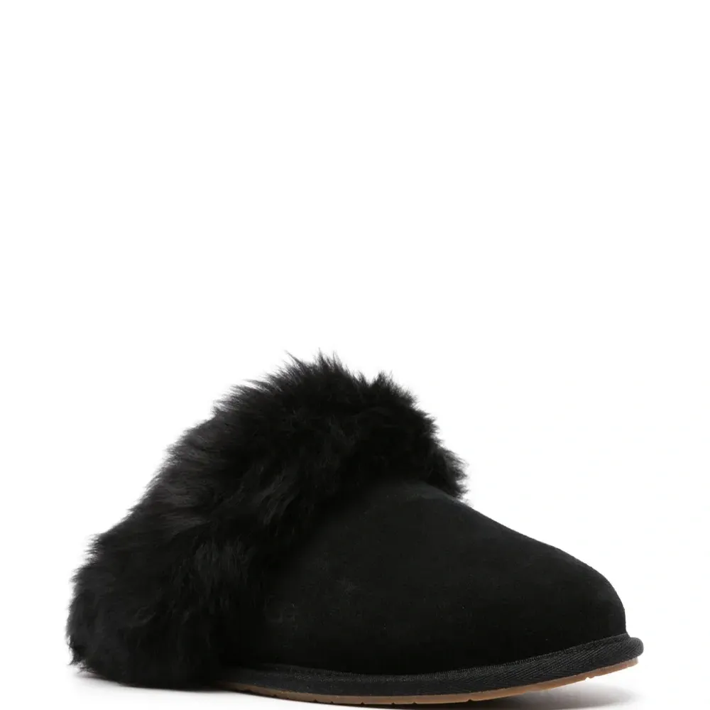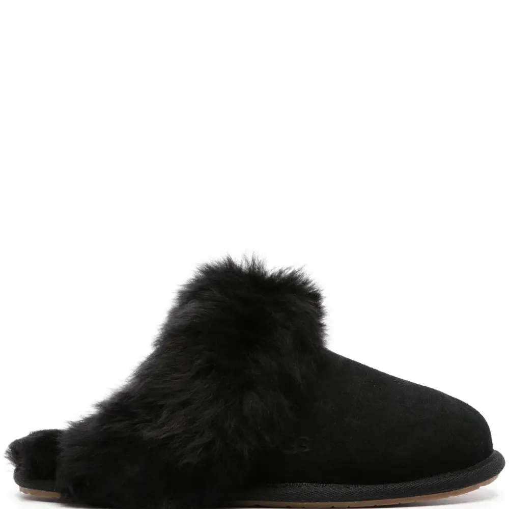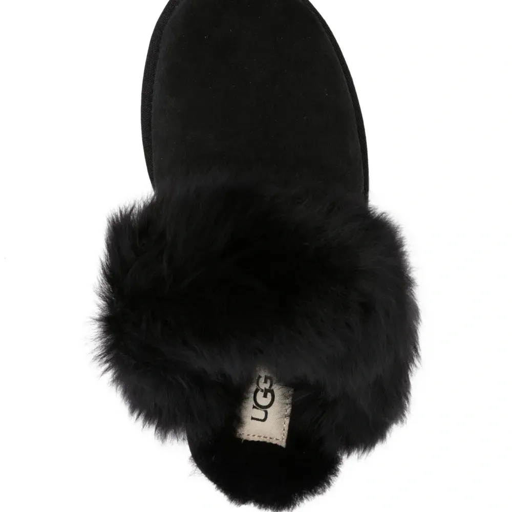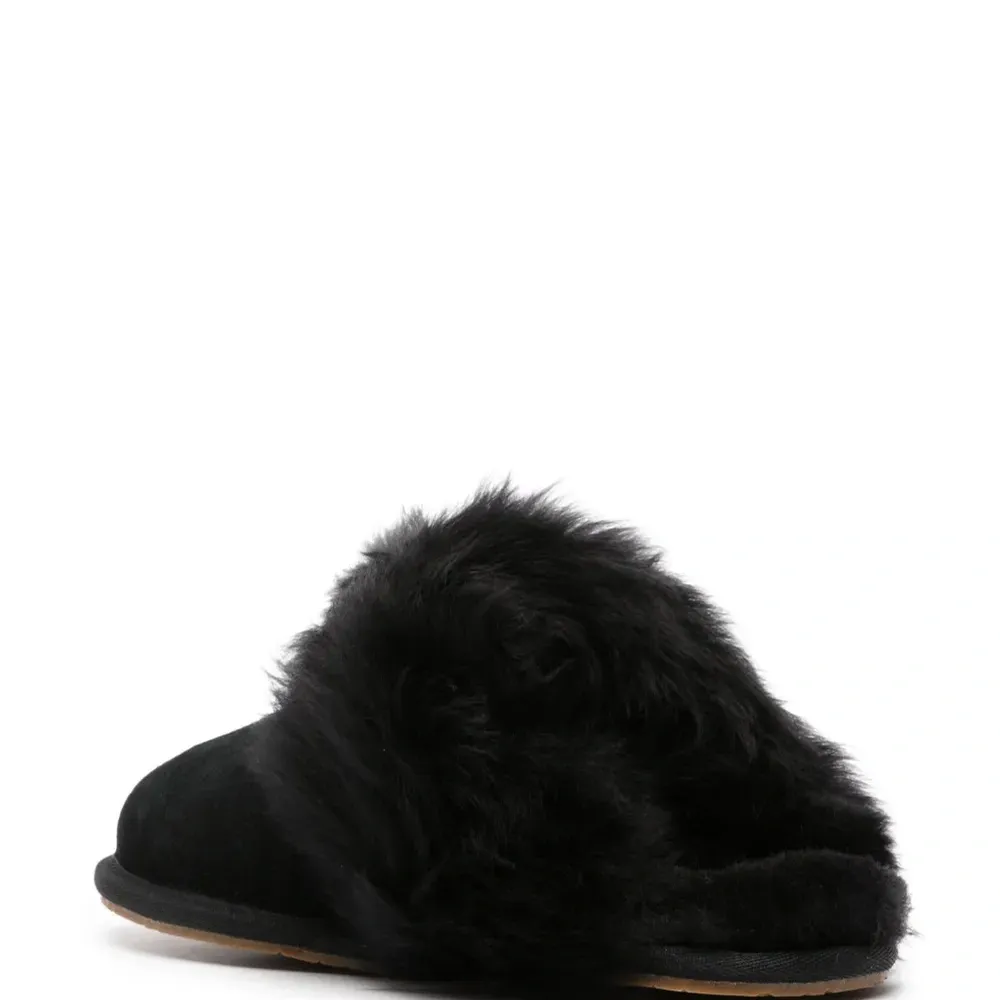 Черный, овчина, тисненый логотип сбоку, закругленный носок, модель без застежки, стелька с логотипом и резиновая подошва.